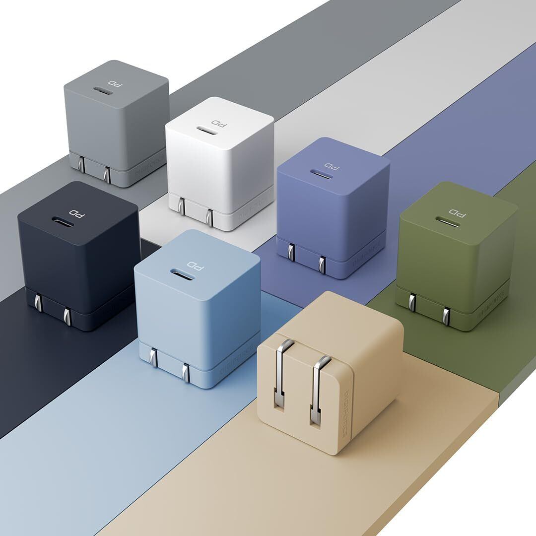 【キューブ型のコンパクトサイズ充電器】業界最小クラスのコンパクトサイズ(約28×28×33mm)。小型なので充電中もコンセント周りがスッキリします。重さは約35gと軽くて、プラグも「折り畳み式プラグ(格納式プラグ)」なので持ち運び用にも最適です。 カラーバリエーションも豊富に取り揃えております。定番カラーのホワイト・ブラック、シックな色味のオリーブグリーン・チャコールグレー・ネイビーブルー、万能カラーのグレージュ、ブルーグレーの7色展開です。好みのカラーをお選びください。