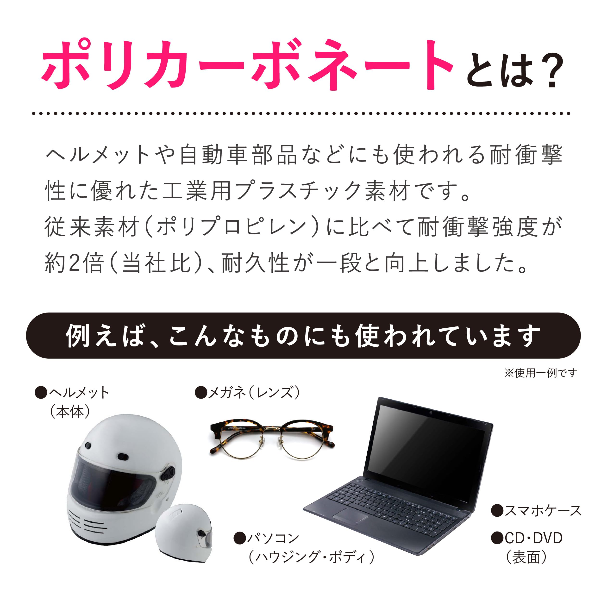 ●ヘルメットや自動車部品などにも使われる耐衝撃性に優れた工業用プラスチック素材「ポリカーボネート」を使用しています。