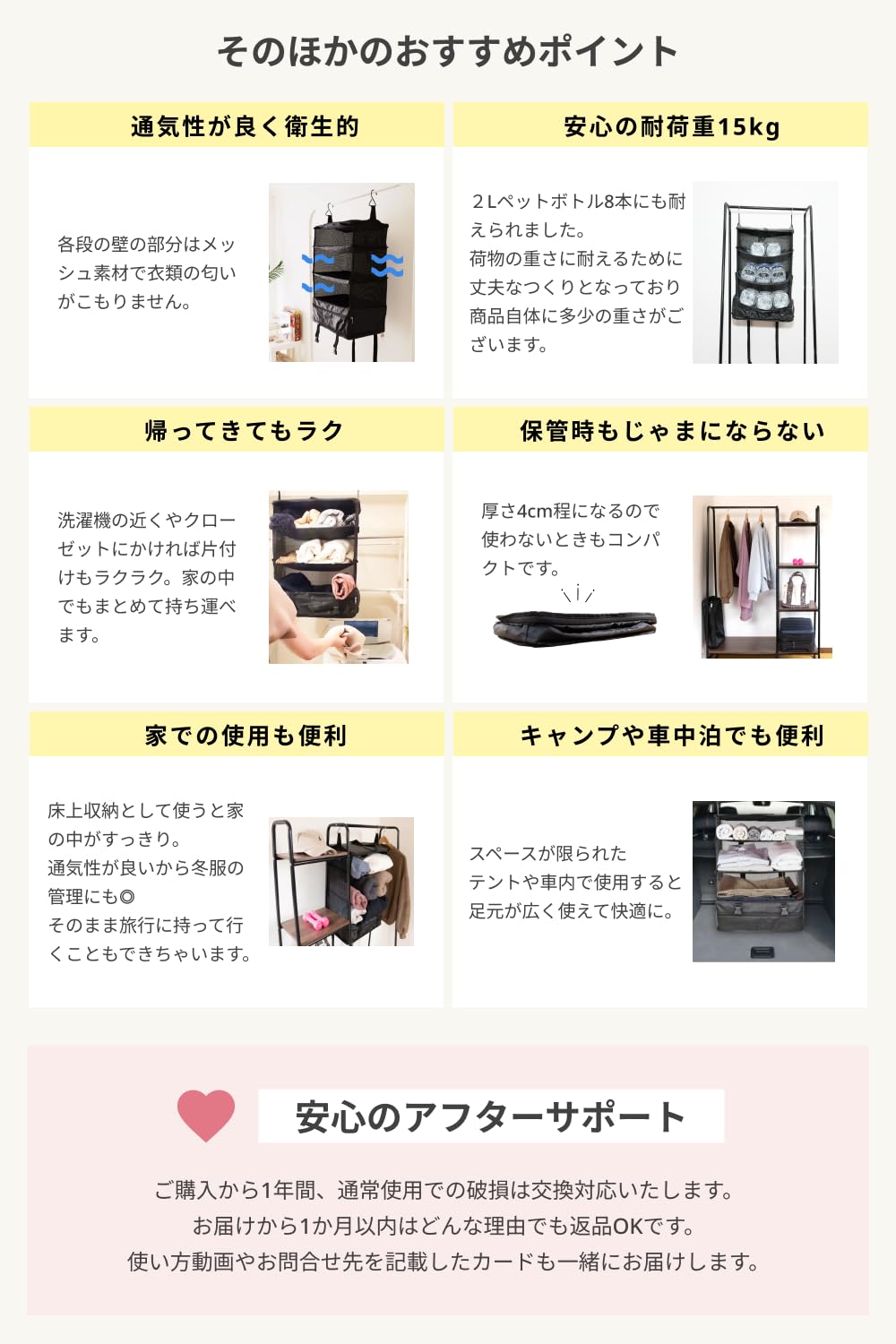 【まだまだあります!おすすめポイント】①通気性が良く衛生的②安心の耐荷重15kg③帰ってからも整理がラク④保管時もじゃまにならない(厚さ4cmで収納可能)⑤家でもキャンプでも車中泊でも便利に使用できる⑥撥水加工