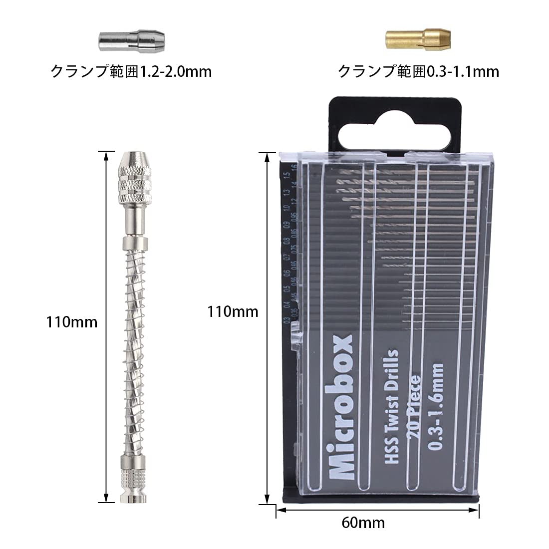 サイズ:20種類ドリル:0.3-1.6mm、ピンバイスハンドドリル全長110mm、2つのチャック、使用する先端に応じてチャックを付け替えることができます。黄色いチャッククランプ範囲は0.3-1.1mmです、ホワイトチャッククランプ範囲は1.2-2.0mmです。