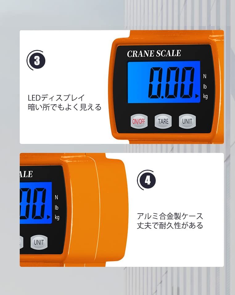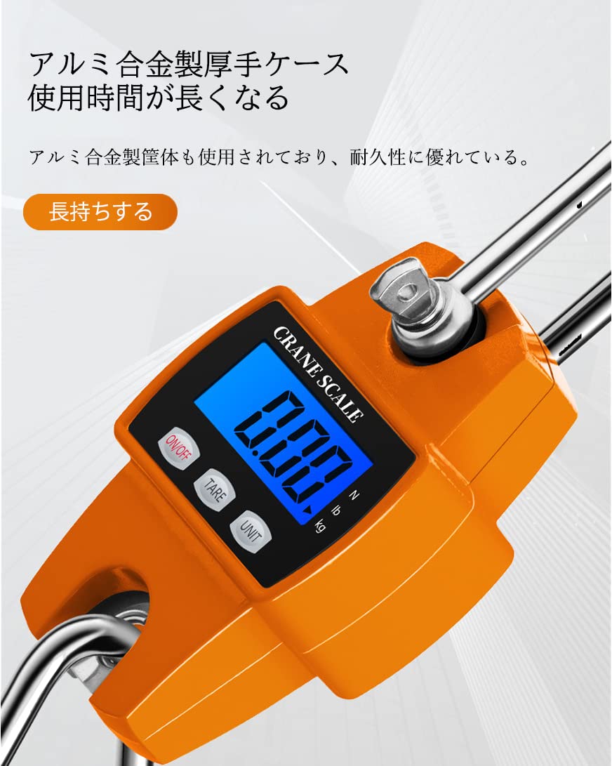 【耐久性抜群、耐荷重300kg】この吊りはかりは、飛行機が使用している鋳造アルミニウム合金の外殻を採用し、耐久性は抜群、頑丈なフックを搭載し、耐久性があり、使用寿命がより長くなる。高強度ステンレス製フックで頑丈で耐久性に優れていて、荷重能力がより強くて、300 kgを荷重することもできます。