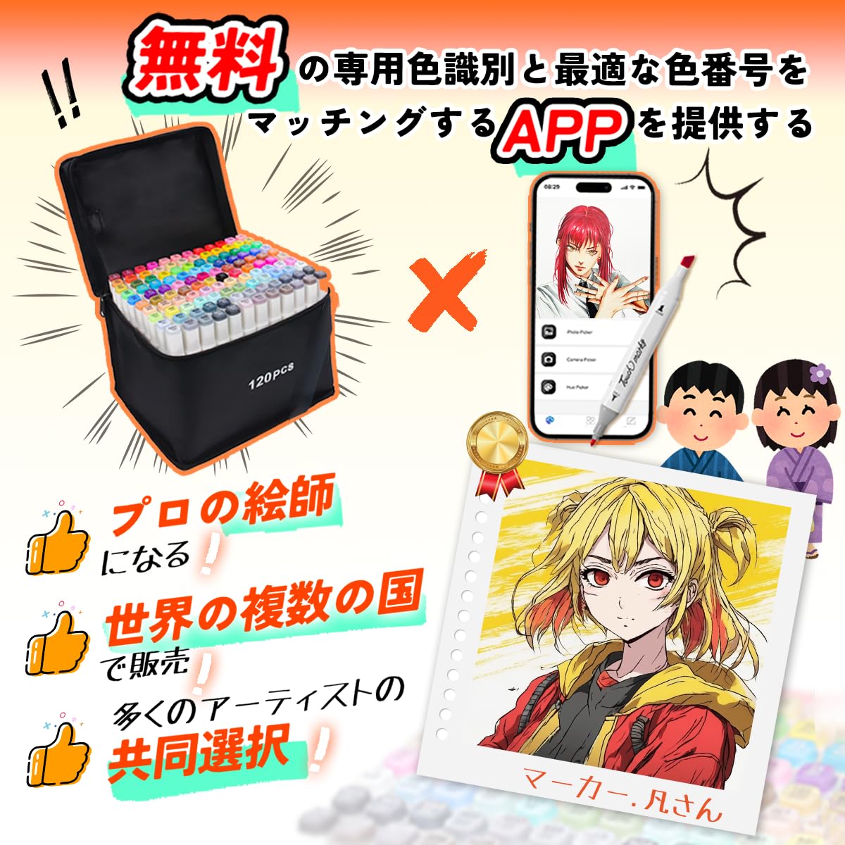 イラストマーカー 120色 カラーペン セット 無料APP付き 太ペンタイプ アルコールマーカー プロ愛用 漫画家 子供 大人