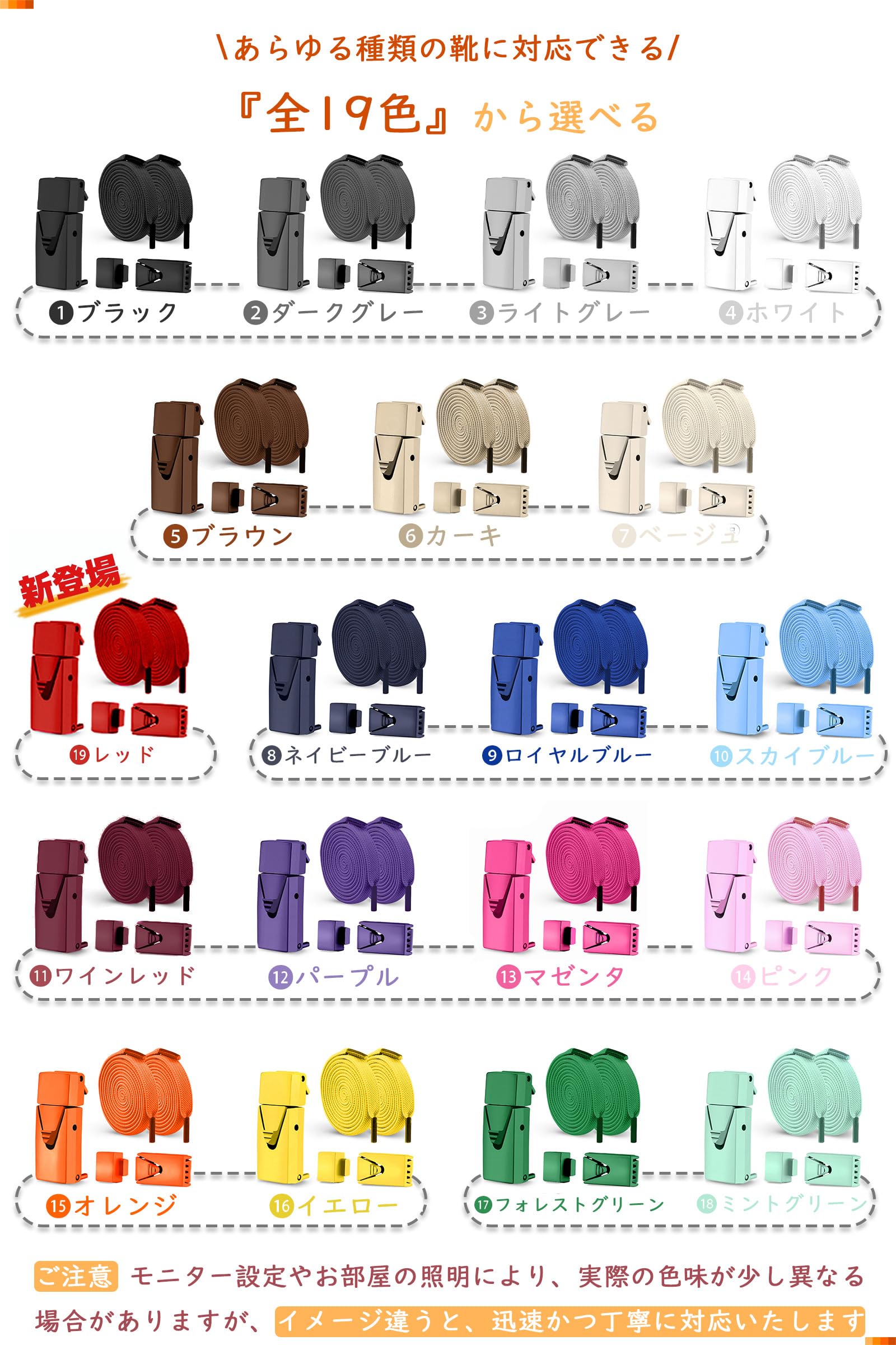 この結ばない靴ひもは、結ぶ必要がなく、伸縮性のあるゴム素材で簡単に脱ぎ履きが可能です。雨の日や急いでいる時でも、靴ひもがほどける心配がありません。2024年新登場の押しボタン式バックルを採用し、従来品のネジ式留め具に比べて取り付けが簡単です。4ステップで装着が完了し、靴ひものねじれを防ぎ、美しい見た目を保ちます。8mm幅の平ひもには8本のゴムが内蔵されており、耐久性が高く引っ張りにも強い仕様です。金属製のバックルを使用しているため、激しい運動でも外れにくく、安心です。また、靴ひもの長さは約100cmで、穴が14個以下の靴に対応可能。弾力性があるため、必要に応じて長さを調整でき、短い靴ひもや子供用の靴にも対応します。スニーカー、ブーツ、ドレスシューズなどあらゆる種類の靴に対応可能な全18色のバリエーションから選べ、バックルと靴ひもが同色で、カラフルなひもを靴のアクセントカラーとして使うことで、オリジナルのコーディネートを楽しむことができます。