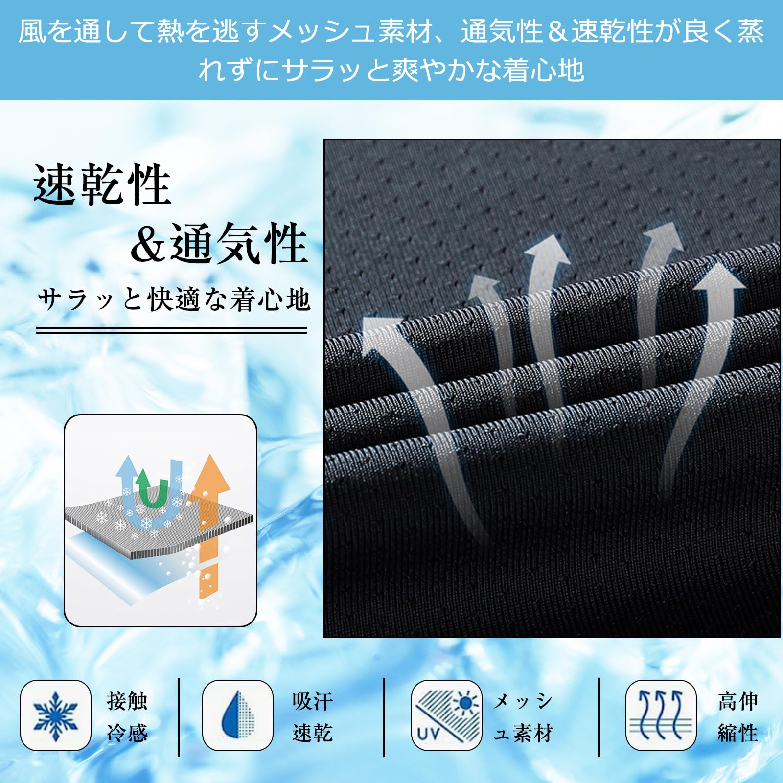 【冷感素材】半袖はソフトな肌触りの冷感素材を使用、素早く身体の熱を逃して暑い日も涼感をキープします。着た瞬間のヒンヤリ感が気持ちいい!!