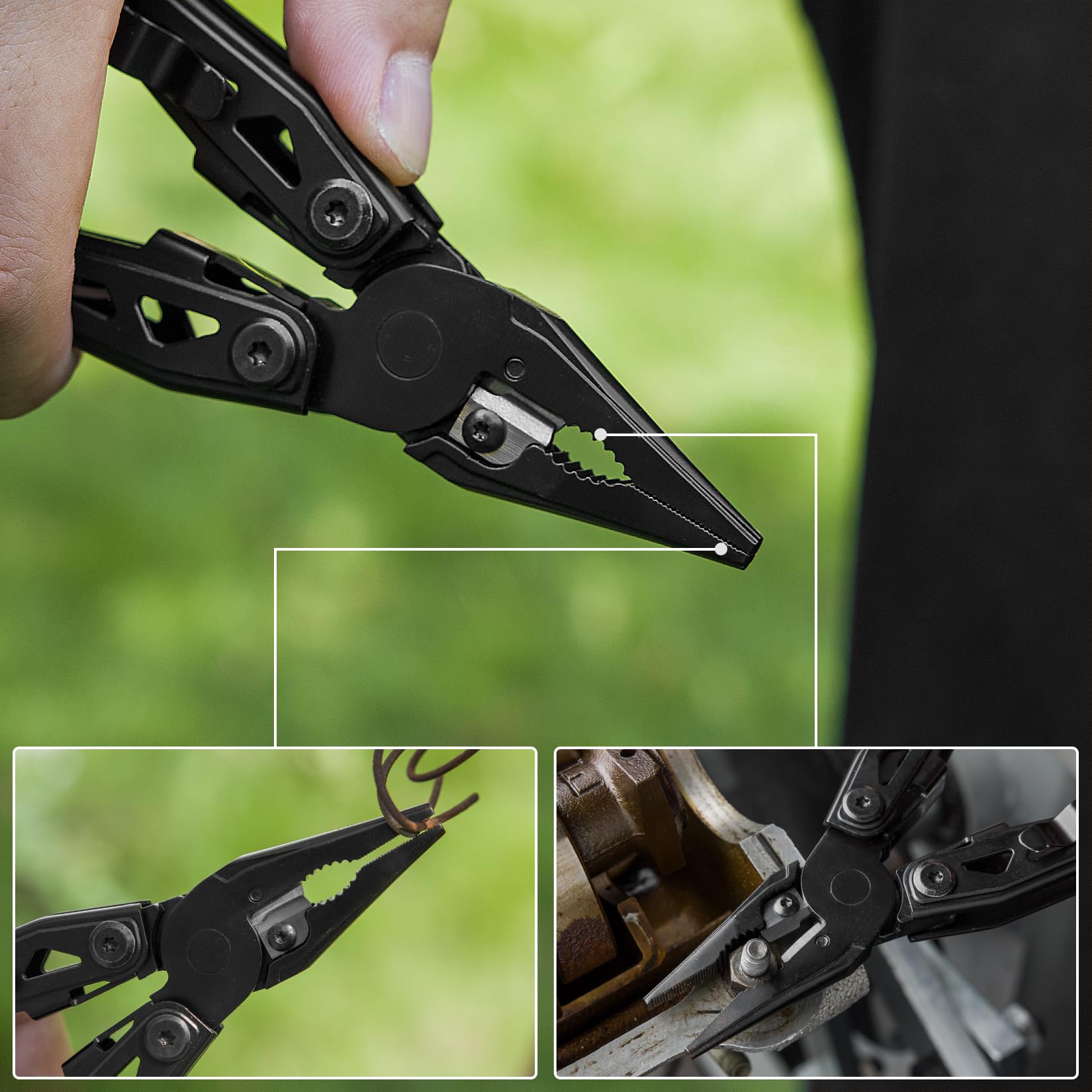 【16-in-1多機能】このマルチツールにラジオペンチ、ボルトグリッパ、硬線用カッター 、軟線用カッター(銅線やアルミ線など)、ハサミ、定規、ナイフ、栓抜き、缶切り、ベルトクリップ、マイナスドライバー*3、ソングホール、スクレーバー、プラスドライバー、計16つの機能を搭載しており、多目的に大活躍になります。