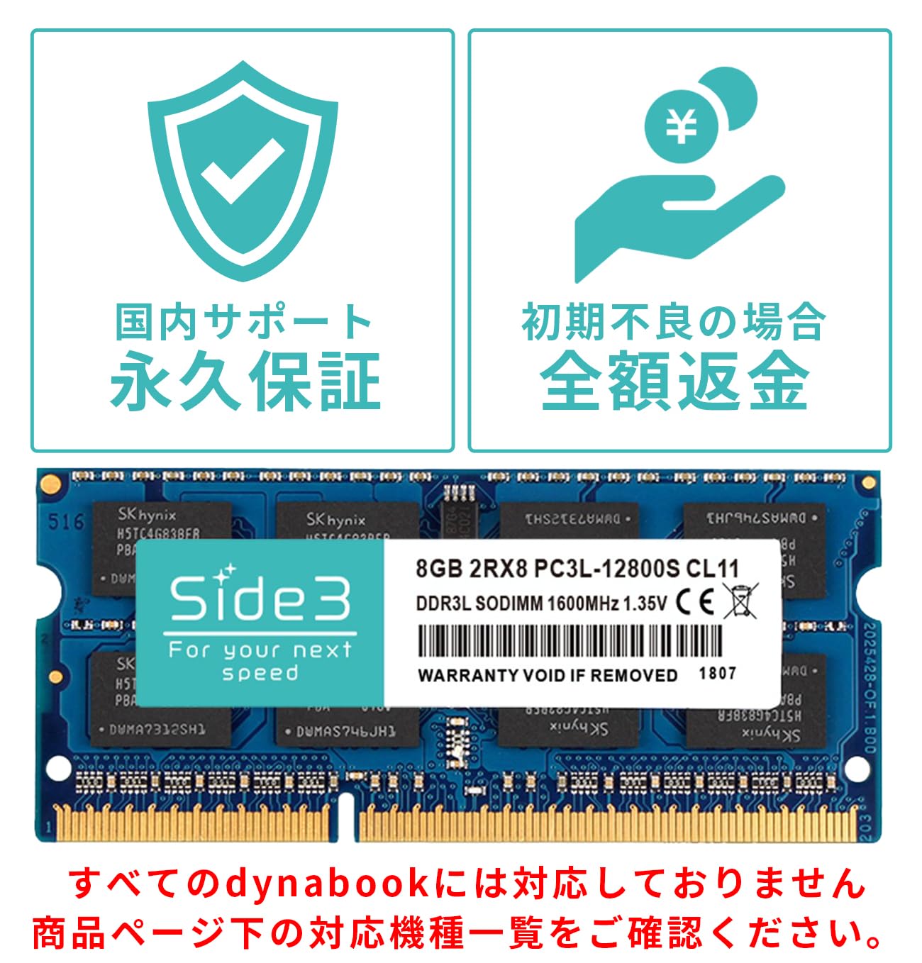 Side3 TOSHIBA dynabook ノートPC用メモリ PC3L-12800 8GB (DDR3L 1600Mhz) 1.35V (低電圧) - 1.5V 両対応