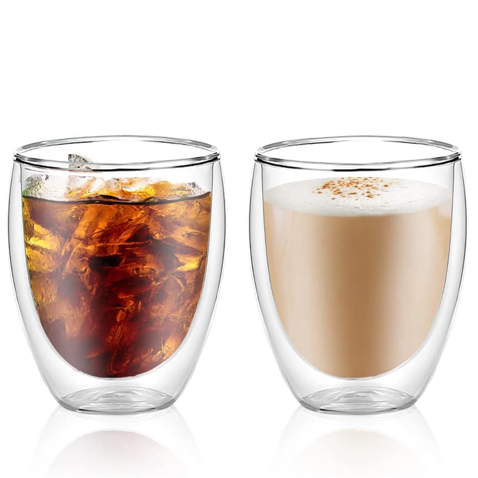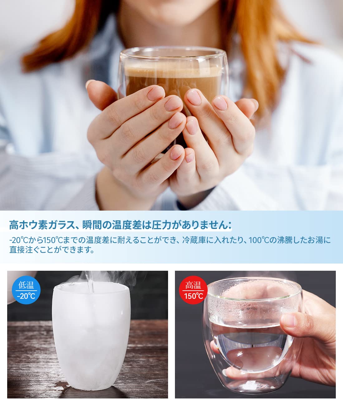 【結露を防ぎ】ダブルウォールグラスのカップは、お湯で表面に露が付かないです。注意:氷入りの冷たい飲み物が表面に露が付きます。