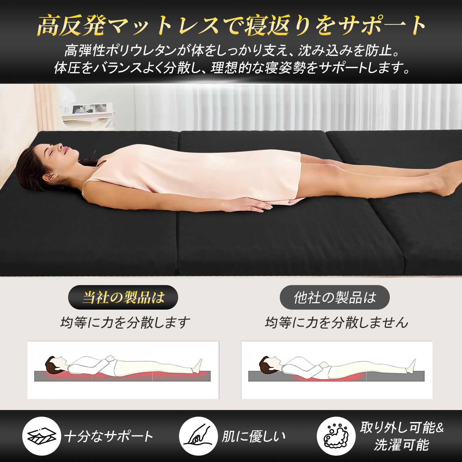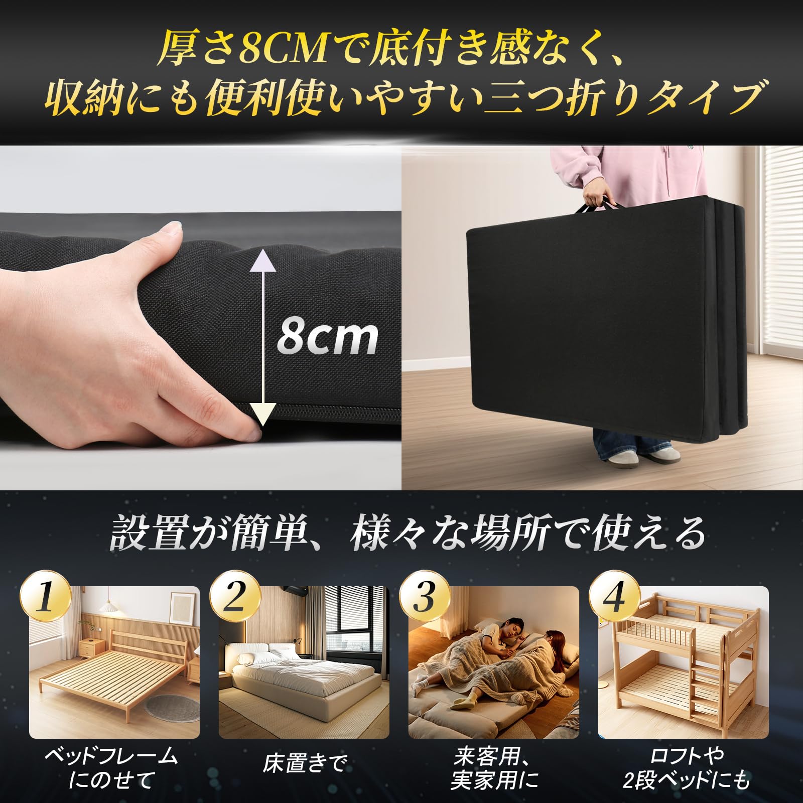 マットレス 折り畳みマットレス 高反発マットレス シングル セミダブル 布団 敷布団 ベッドマット 寝具 三つ折り ベッド 厚さ8CM 来客用布団 コンパクト収納 洗えるカバー 凹凸加工 抗菌防臭 オールシーズン (ブラック シングル 197*97*8)