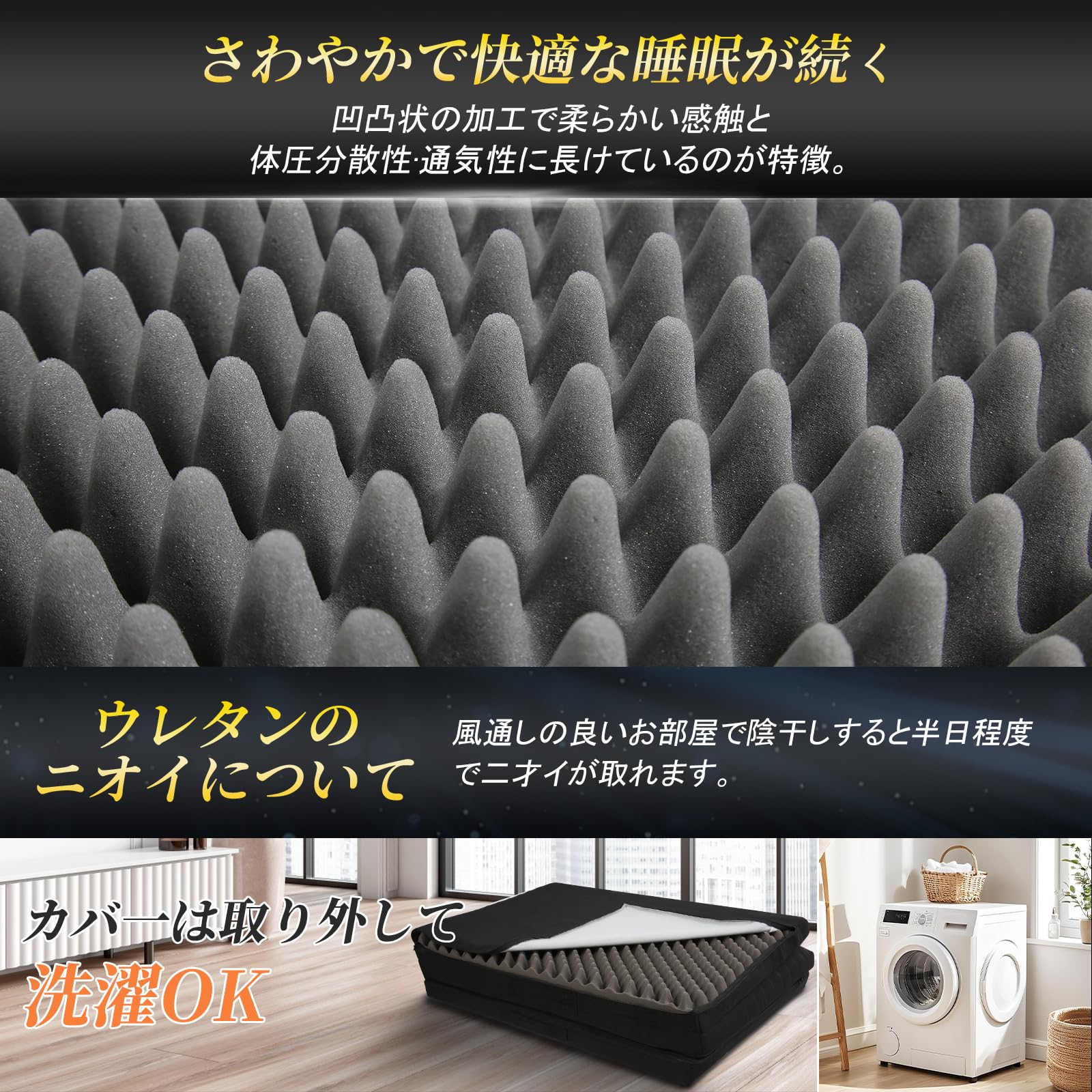 【凹凸加工でさらに快適な寝心地】 ウレタンフォームには細かな凹凸加工が施されており、点で体を支えながら、背中・腰・お尻の体圧を均等に分散します。これにより、血行が妨げられず、質の高い睡眠をサポートします。横向きで寝ても肩にかかる圧迫感を軽減し、通気性も良いため、熱がこもりにくく、爽やかな睡眠環境を提供。特に蒸し暑い季節や寝返りが多い方に最適です。