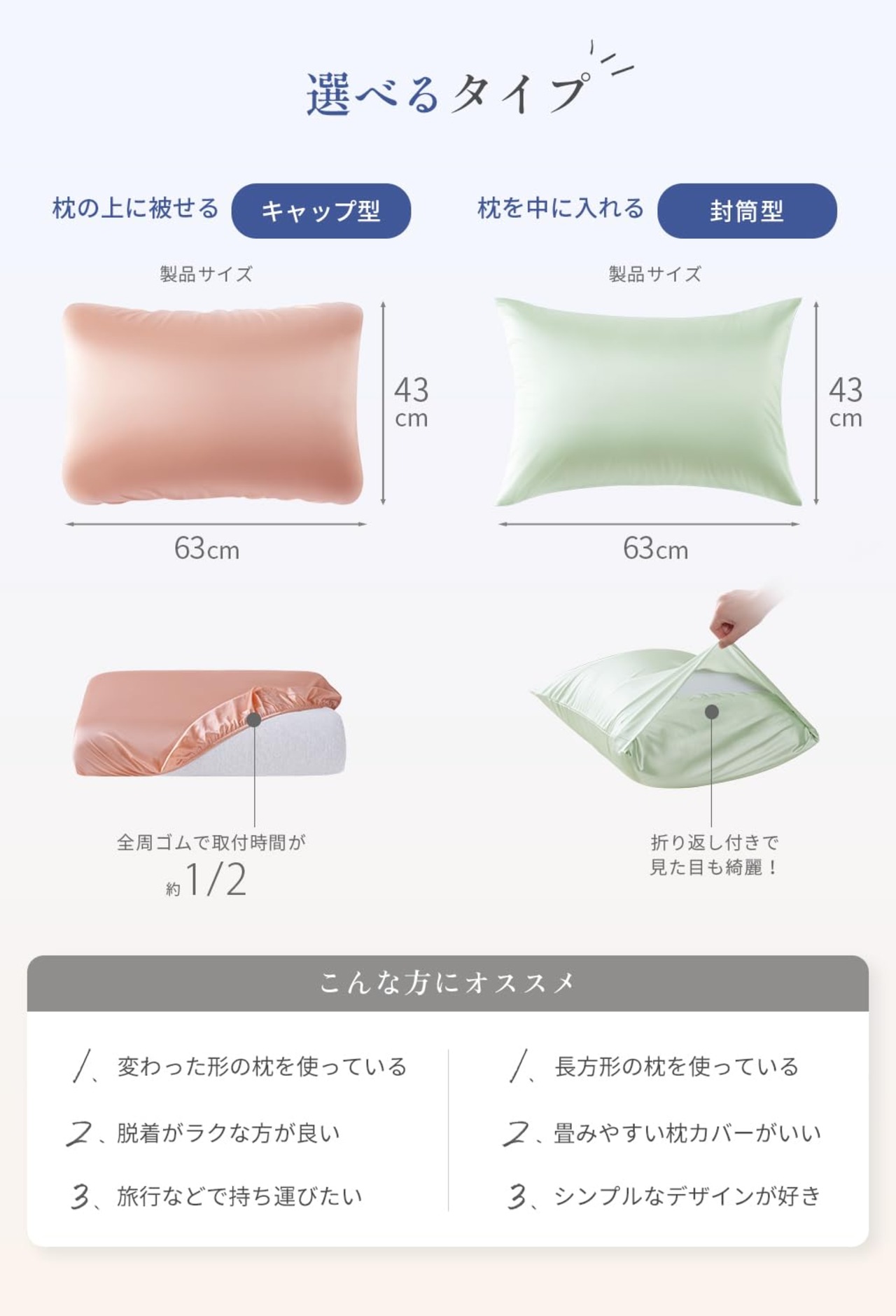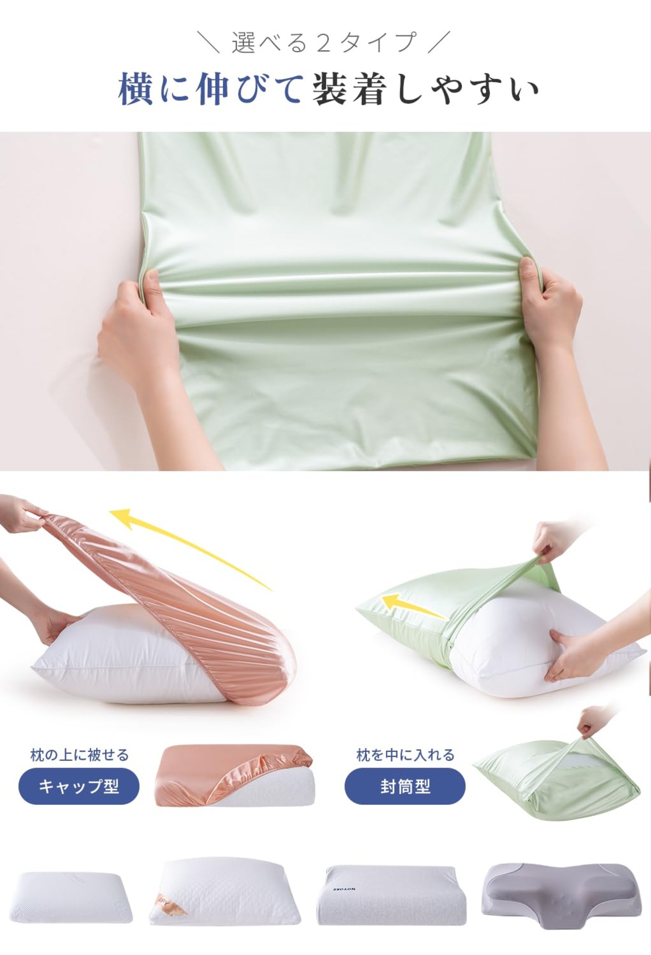 【封筒・キャップ型 通気・抗菌】便利な2タイプをご用意しております。「封筒式サテン枕カバー」両面ともシルクのようななめらかな肌触り、裏にファスナーなしのデザインを採用され、生地が柔らかくて、簡単に取り外して洗えます。「キャップ式サテン枕カバー」パッと広げて被せるだけの簡単仕様。伸縮性のあるゴムが枕をしっかりホールドするので、寝返りを打ってもずれにくい設計です。多くの種類の枕に対応できるため、どんな枕にもフィットしやすく、使い勝手が抜群です。どちらも高級シルクのようななめらかな肌触りで、髪に優しく、洗濯も簡単。お好みや使いやすさでお選びいただけます。保湿性や通気性に優れているだけでなく、抗菌性にも優れているのでとっても衛生的。
