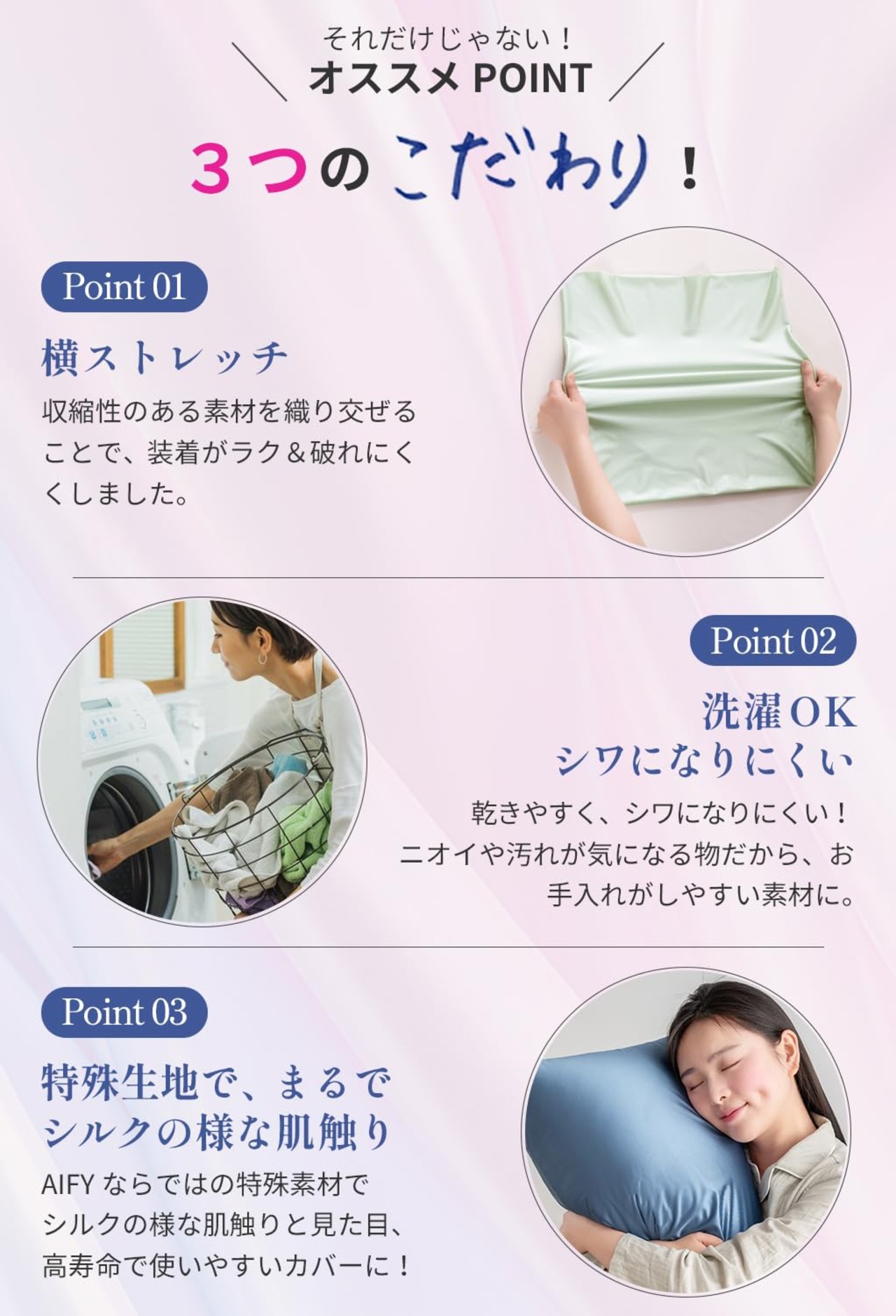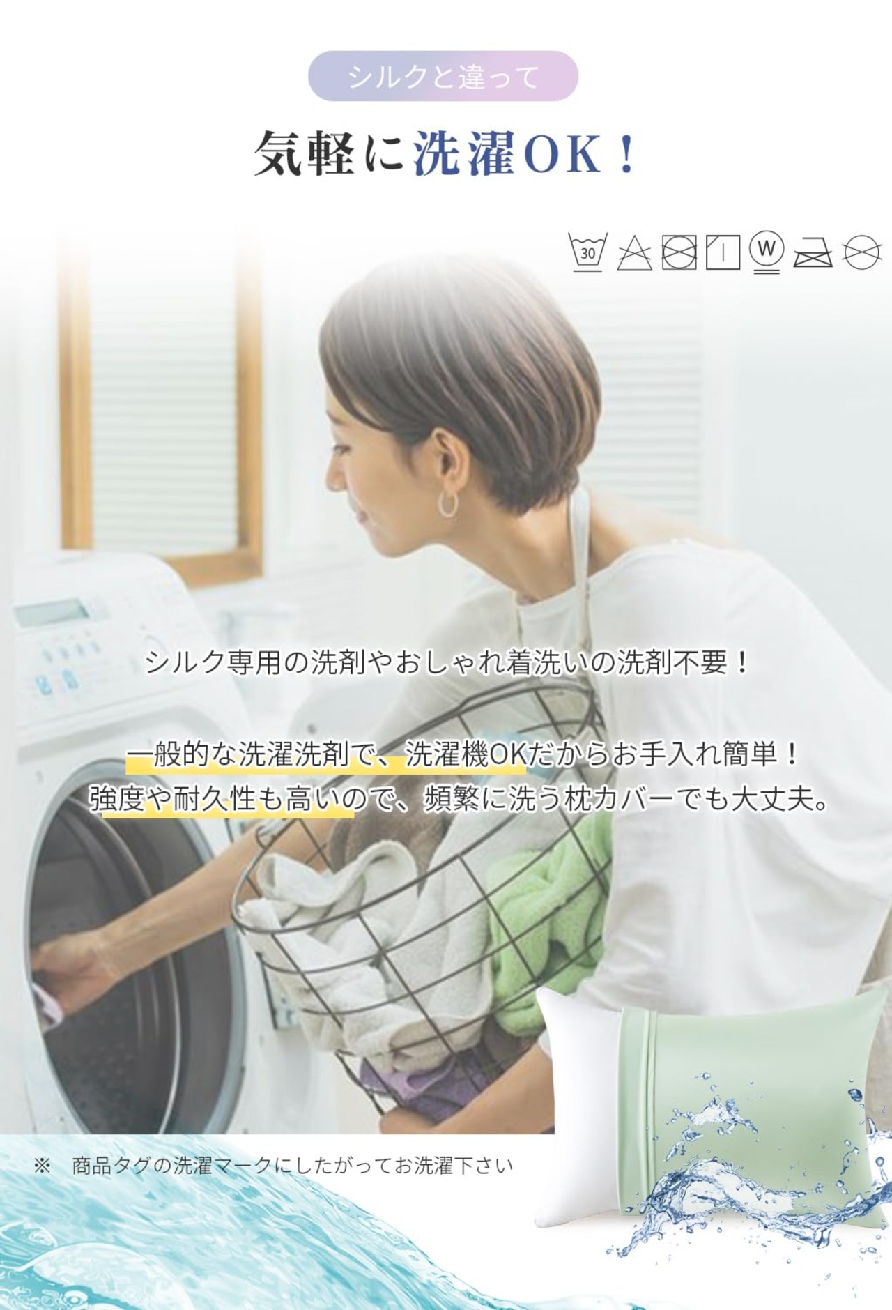 【洗濯機洗い可能】ご自宅の洗濯機で丸洗い可能、いつでも清潔に使えます。洗濯後のシワになりにくいのはもちろん、繰り返し使用でも耐久性抜群。従来のシルク製品の面倒なお手入れから解放され、上質な寝心地を毎日手軽に楽しめます。