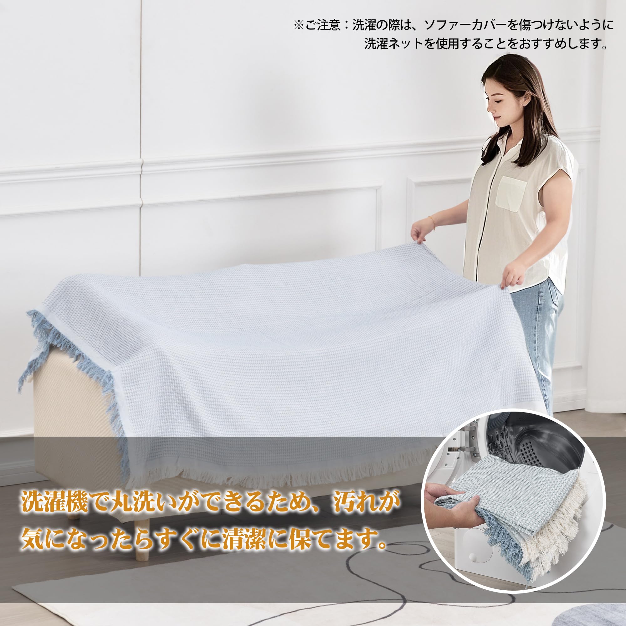 【幅広い使用範囲】ソファーカバーは肌触りが柔らかく、通気性と吸湿性にも優れており、快適な使い心地を実現します。ソファーカバーとしての使用はもちろん、ベッドスローやラグ、テーブルクロス、ブランケットなど、多目的に活用できます。さらに、急な来客時には目隠しとしてサッと使えるので便利です。自宅だけでなく、カフェやオフィス、ホテル、宿泊施設など、さまざまな場所でお使いいただけます。