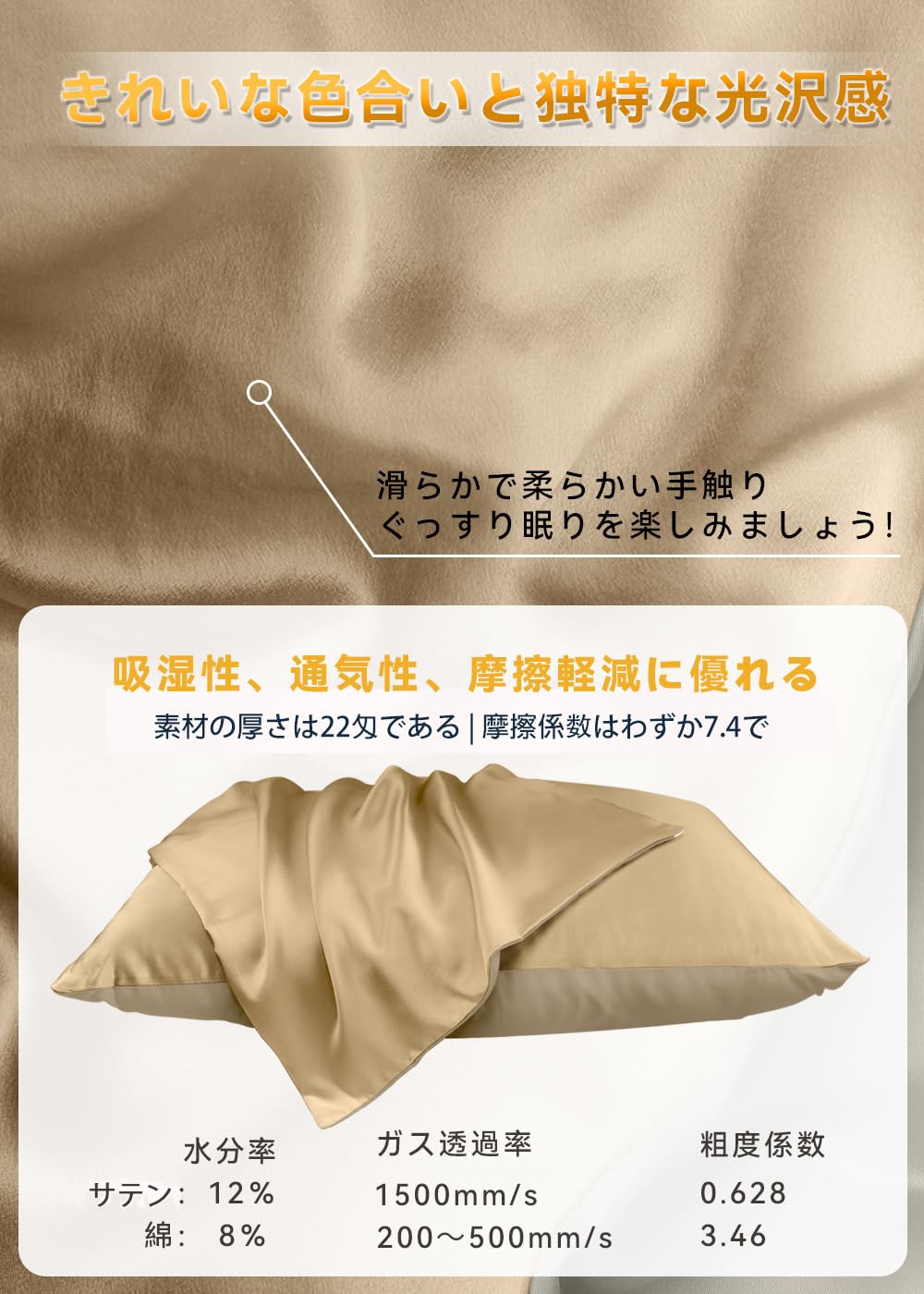ottosvo 枕カバー 両面サテン 22匁 封筒式枕カバー 洗える サテンまくらカバー 良い通気性 うるつや髪 美髪 肌に優しい 摩擦軽減 防ダニ 抗菌防臭 サラサラ 四季適応 贈り物 プレゼント最適 ピローケース 1枚セット(43x63cm シャンパンゴールド)