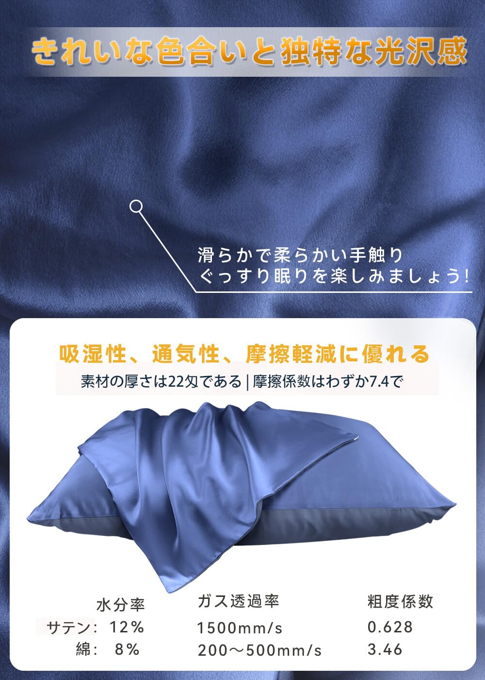 【柔らかくて良い通気性】サテンの柔らかさは純綿よりも優れており、純綿の表面粗さ係数は3.46、サテンの表面粗さ係数は0.628しかないため、肌に触れても違和感がありません。女性にとって、生地の柔らかさに対する要求がもっと高いですので、本両面サテンが良い選択です。サテンは多孔性繊維の一種であり、吸湿性と放湿性と通気性にも優れています。純粋な綿と比較して、サテンの枕カバーがもっと良い選択です。