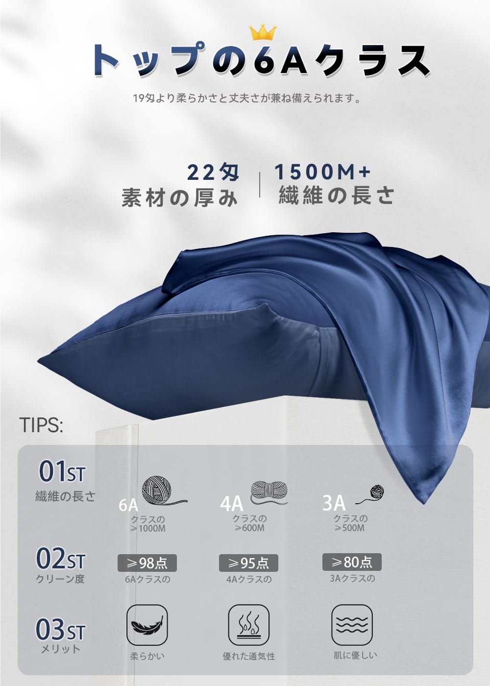【22匁の両面サテン枕カバー】6Aクラス22匁のサテン枕カバー。サテンの含量が市販の19匁タイプをはるかに上回るため、より滑らかでドレープ性に優れ、サラサラツルツルしていて心地良いです。裏面はシートと接触することが多く、擦れに強いという特徴があります。両面とも肌に優しい素材なので、敏感肌の方や赤ちゃんでも安心して使用できます。