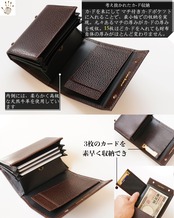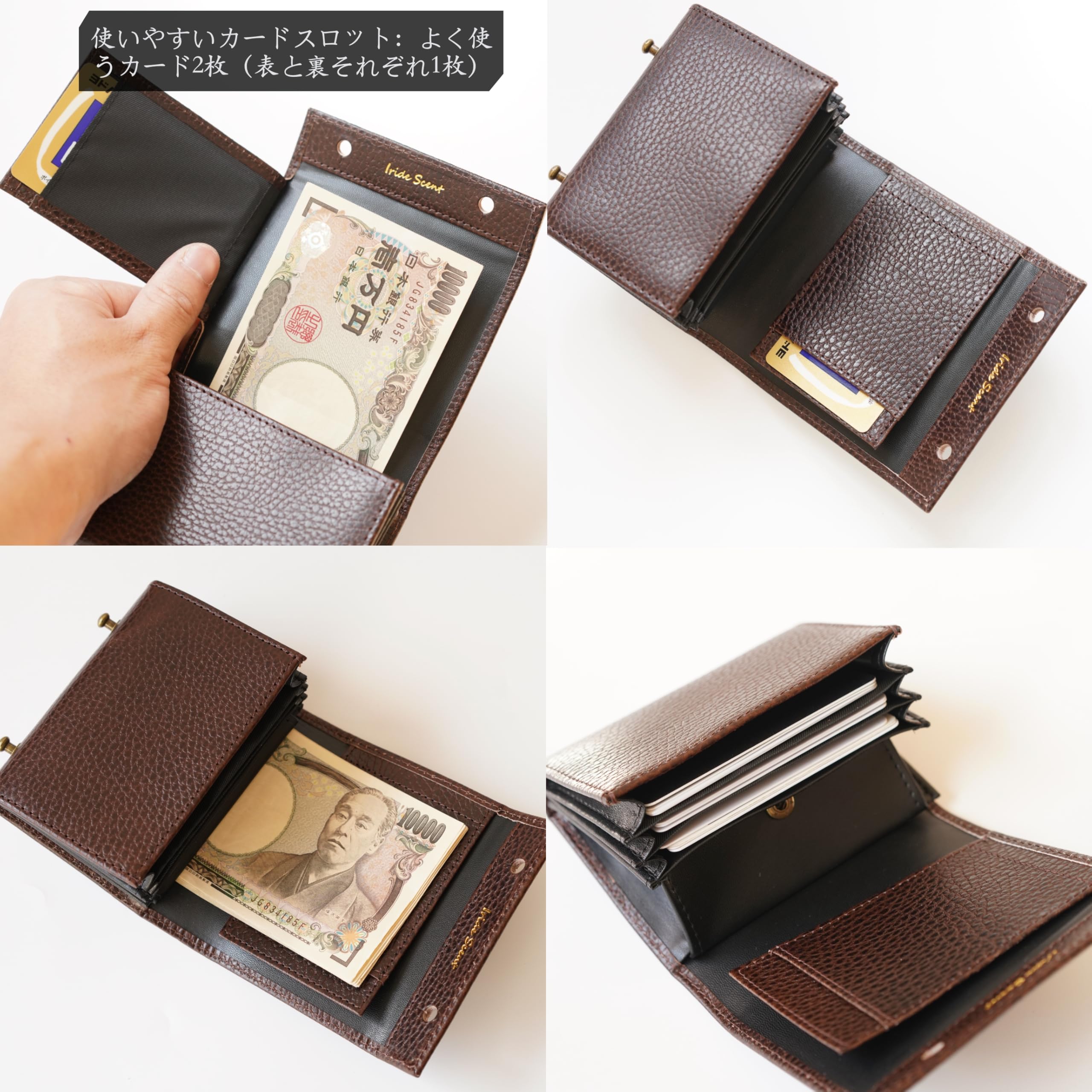 【サイズと容量】幅10.8cm / 高さ8.6cm / 厚み2.7cm。3つの大容量カードスロットと2つの便利なアクセスカードスロットを持ってい。小銭袋は箱型で硬貨を出し入れしやすいようになっています。カード15枚,コイン15~20枚,紙幣20枚を収納でき