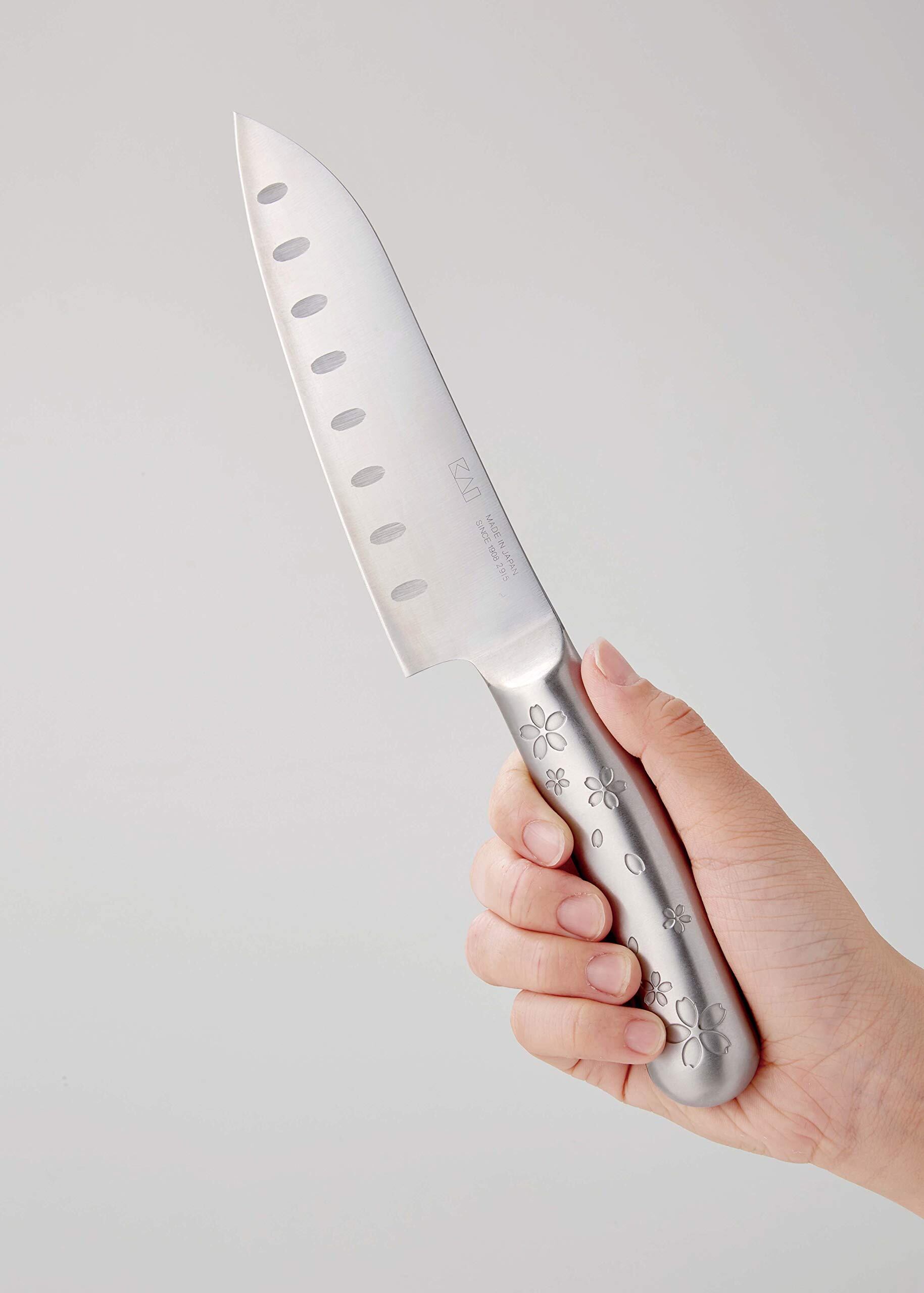 柄の部分に刻まれた桜模様はすべり止めの役目も。握りやすくてすべりにくく、しかもおしゃれ。