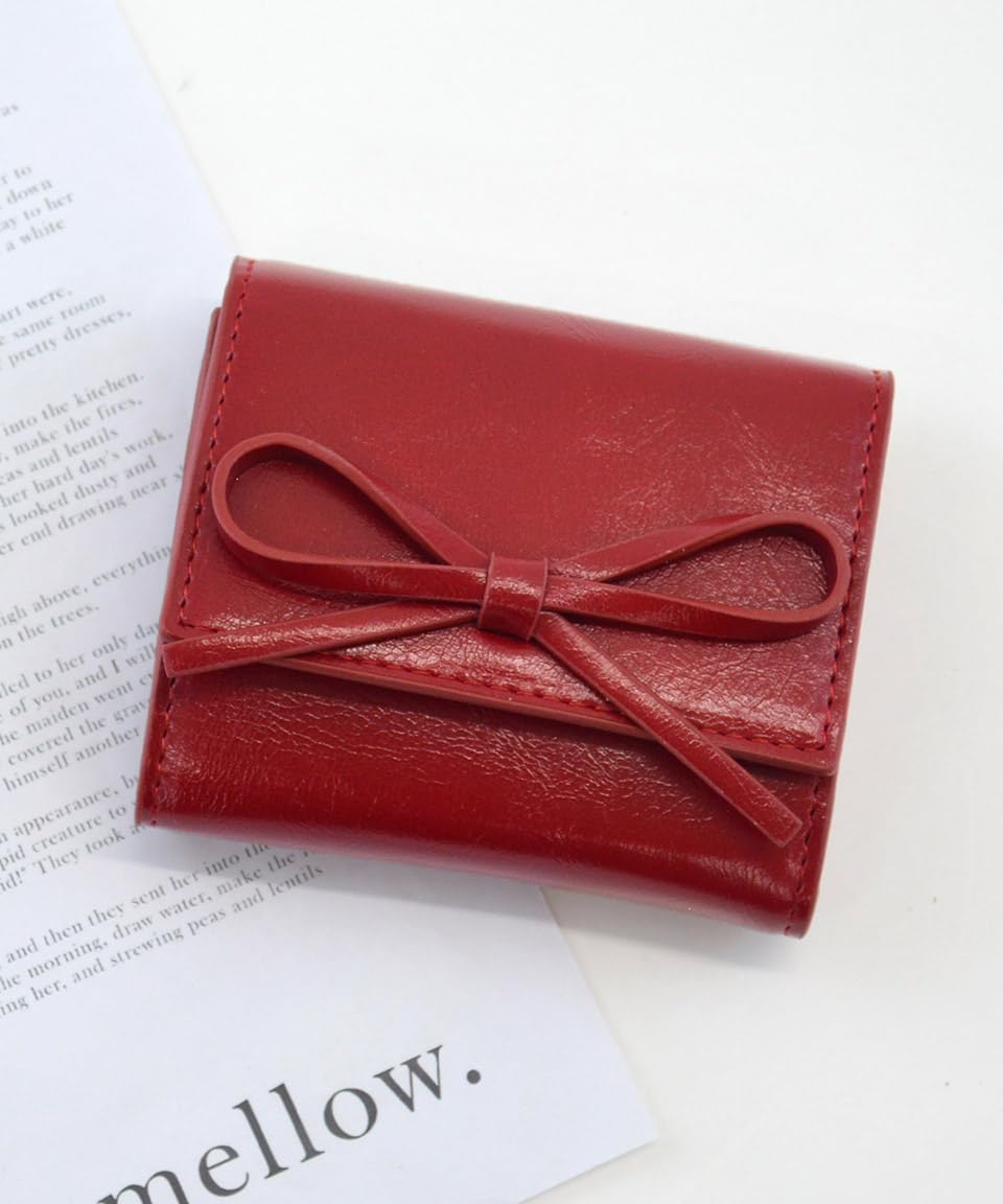 ・リボンがトレンドライクな三つ折り財布。・細めの大きいリボンがポイント!・内側の小銭入れは、見やすく取り出しやすいボックス型。・縦からも横からも出し入れできる札入れで、支払いもスマート。・内側のカードポケットは7つあり、見た目以上の収納力もポイント。・片手に収まるちょうどイイサイズ感で、小さめのバッグにもぴったり。