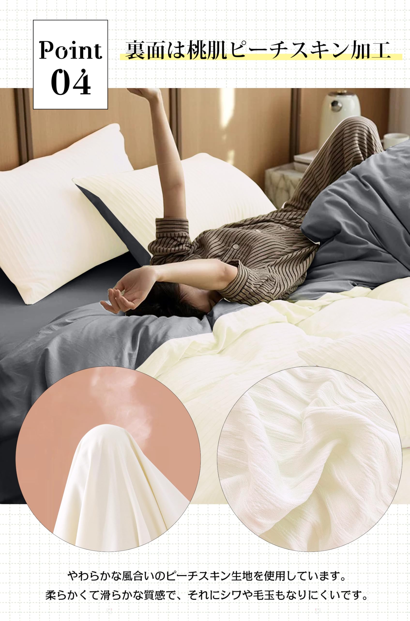 【シンプルなデザイン】シアサッカー生地&クシュクシュ加工が可愛い!表面の凹凸によって、生地が肌に触れる面積が少なくて、肌と生地の間に空間ができるため通気性がよく快適に過ごせます。しわになりにくく、色落ちしにくく、毛玉ができにくく、快適な睡眠を誘います。どんな季節でも気軽に洗えるから、清潔にお使い頂けます。お部屋の雰囲気がぴったり合わせます。布団カバーの側面の全開ファスナーのデザイン、使い勝手が良いです。装着やすい、取り換えも簡単です。「掛布団カバー」が揃うお得な寝具カバーで、洋式・和式兼用でマットレスでも敷布団でもご使用いただけます。