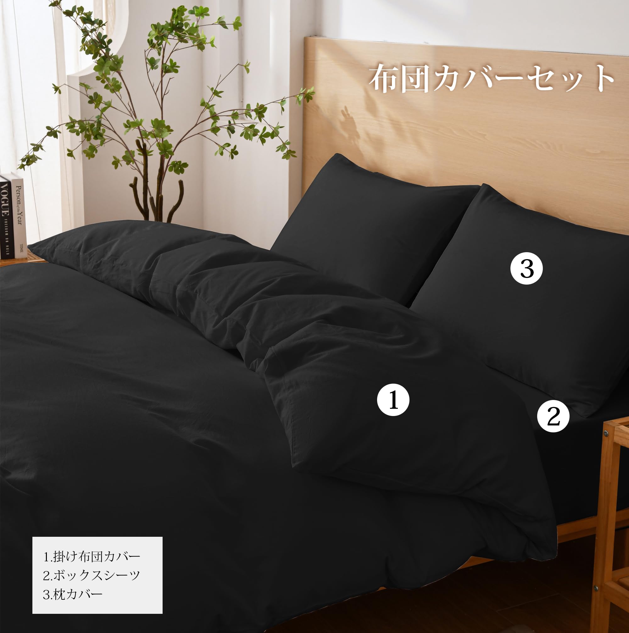 AYO 寝具カバーセット 布団カバーセット 洗いざらし シワ加工 水洗い やわらか (掛け布団カバー ボックスシーツ 枕カバー)吸水速乾 丸洗いOK 肌に優しい 無地 シンプル オールシーズン(シングル・3点セット ブラック)
