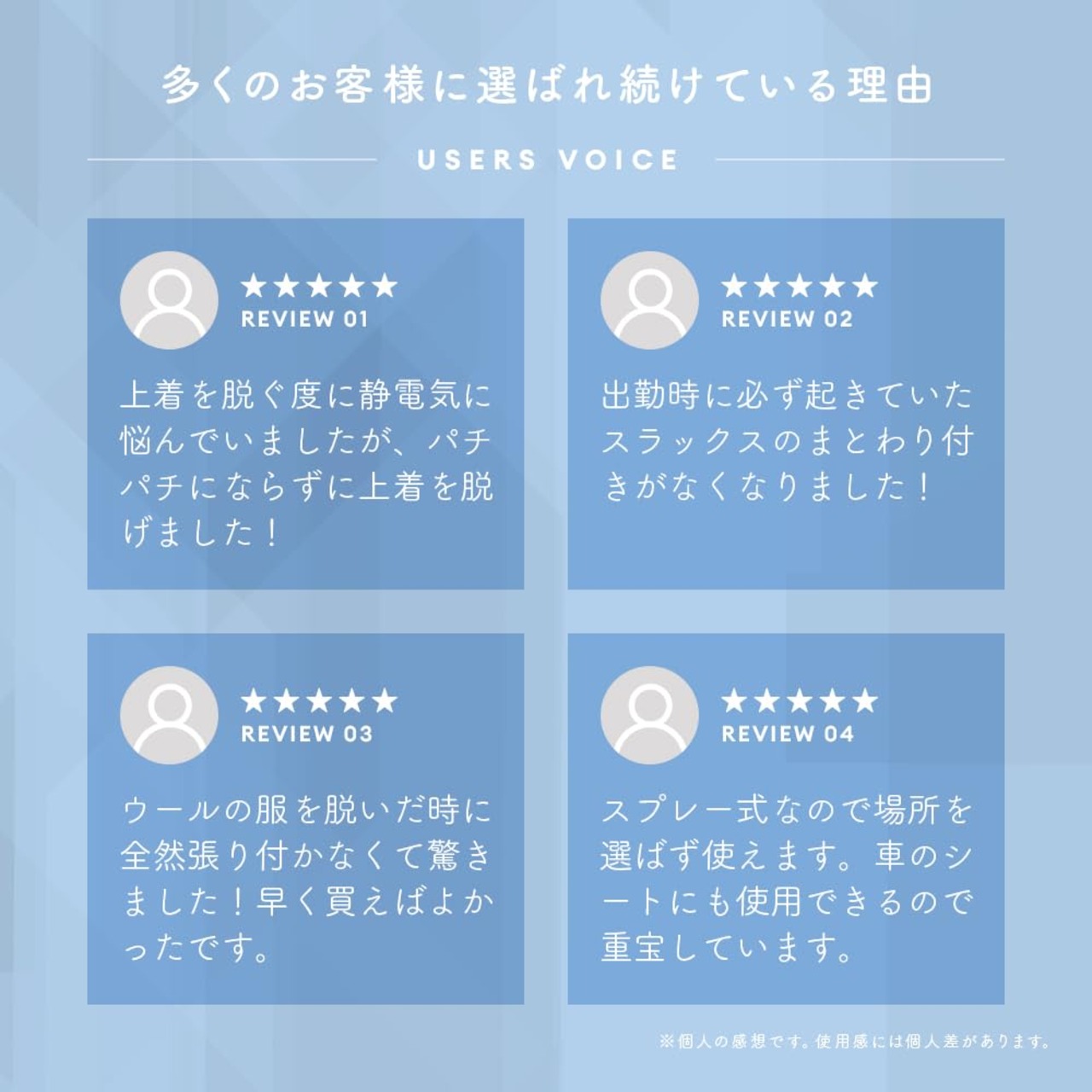 【1日1回、お出かけ前にスプレー】繊維が摩擦することで起こる静電気の発生を抑制!静電気が帯電しにくくなり、 埃の付着や花粉対策にも。