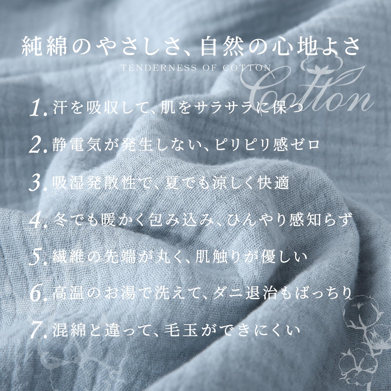 【オールシーズン快適】ガーゼ生地は、快適な寝心地を提供します。快乾性と通気性に優れており、ジメジメした春やムシムシした夏でも蒸れにくく、サラッと涼しく眠りにつけます。二重織りのガーゼは生地と生地の間に空気層ができ、秋冬はほどよい保温力を発揮して、心地よい暖かさを感じられます。また、天然素材なので、乾燥する季節でも静電気が起きにくく、年間を通して快適にお使いいただけます。