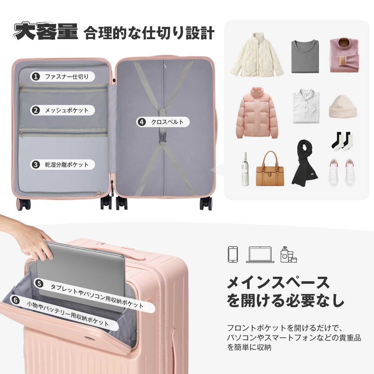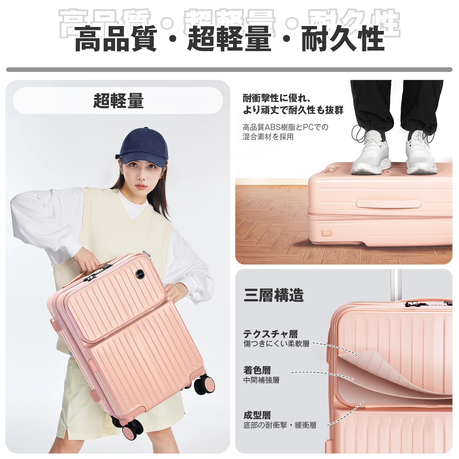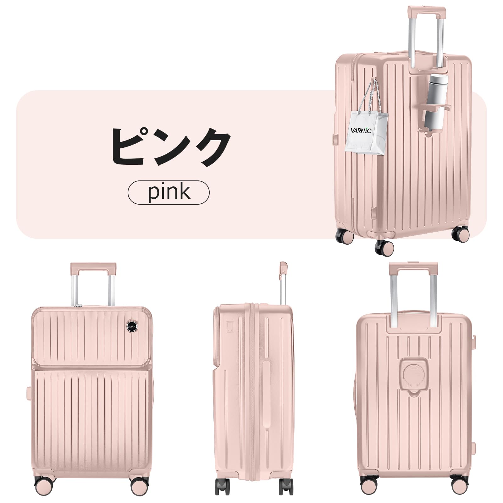 [VARNIC] スーツケース トップオープン式 多機能 キャリーバッグ USBポート付き カップホルダー付き キャリーケース 三段階調節キャリバー ABS+PC 超軽量 耐衝撃 振動軽減 静音 360度回転 ダブルキャスター 物掛けフック式底足 オシャレ 通学 ビジネス 旅行 出張 (ピンク Mサイズ (4~7泊))