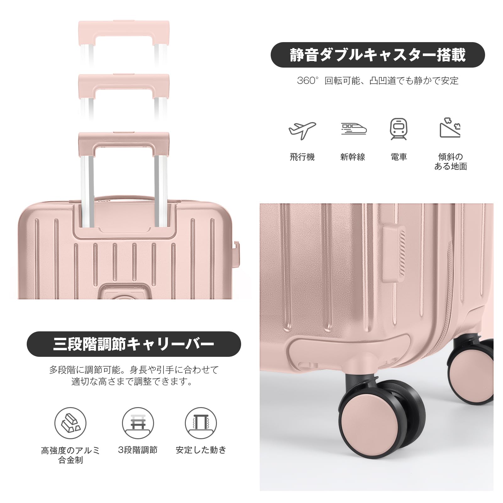 【360°回転可能な静音キャスター】キャリーバッグは静音ダブルキャスターを搭載し、スムーズな滑りを実現しながら、360度の自由回転もできます。走行中の振動を軽減し、安定性が大幅に向上させます。さらに、旅行中などあらゆるシーンで発生する騒音を軽減し、不快感や違和感から解放された旅を楽しめます。