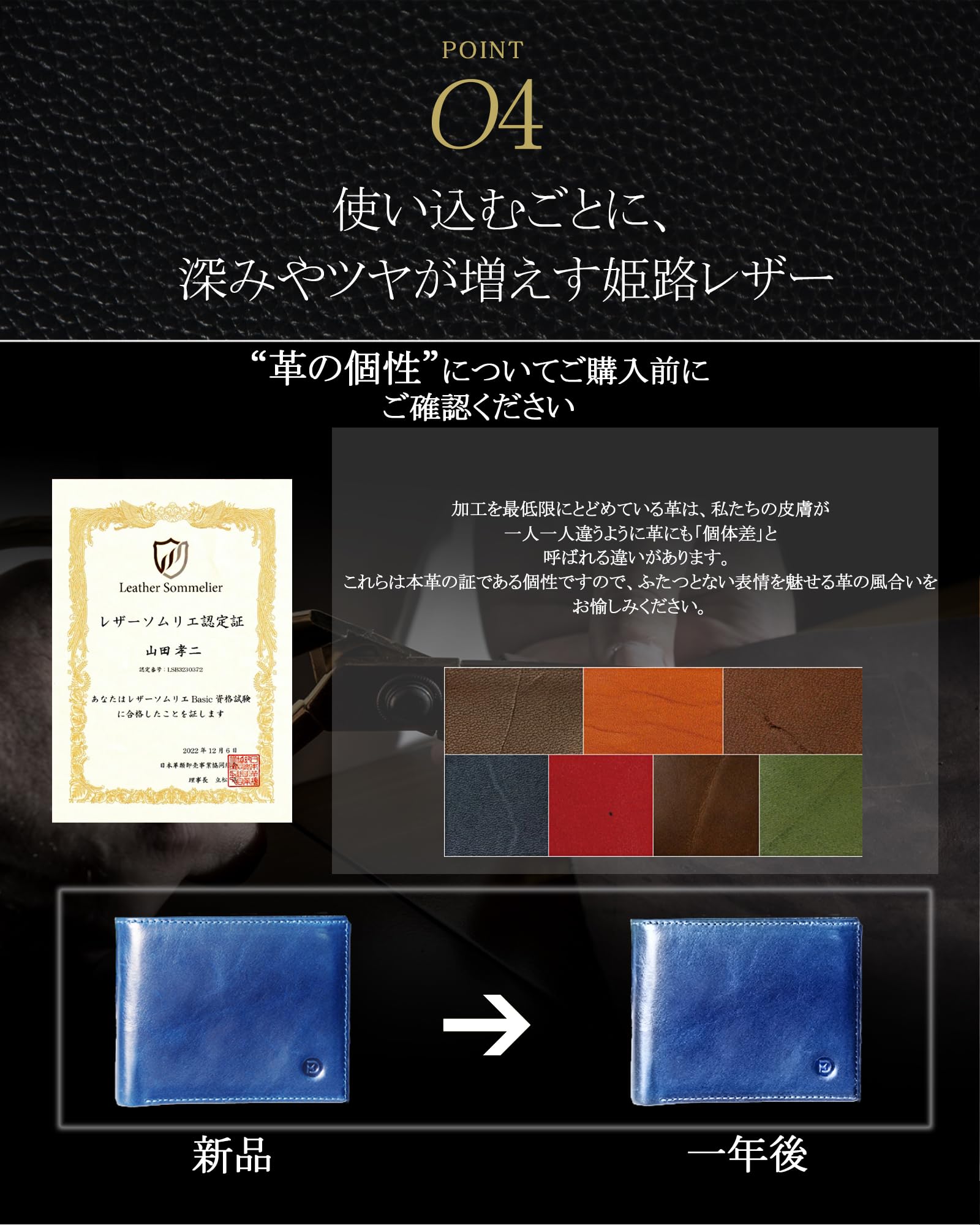 【姫路レザー 日本製 財布】様々なレザーグッズなど、姫路レザーの製品はすべてクラシックでありながらも時代を超えたスタイルを見せています。レザー素材は厳選され、天然の風合いや色合いが残され、独特の質感と光沢を放ちます。さらに製造技術は日本の長い皮革製造の伝統に基づいており、一流の革職人が作る。見事な縫製技術や細部へのこだわりが、製品の品質と耐久性を保証しています。