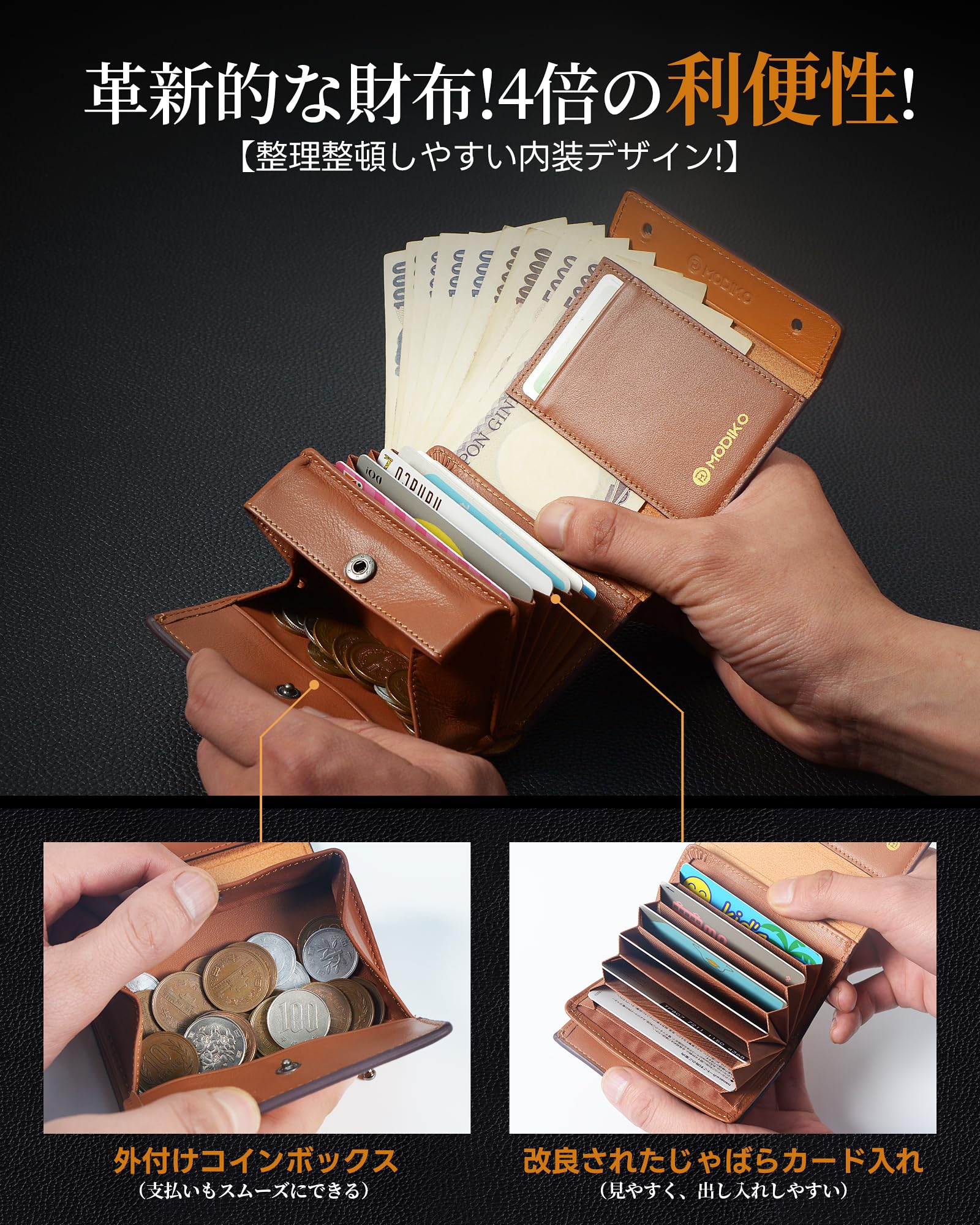 『革新的なデザイン』使いやすさと洗練されたデザインの融合二つ折り財布。独自の「じゃばら式」カード収納システムは、カードの取り出しをスムーズします。また、特別な設計により、紙幣を折り畳まず、角を折らない。さらに、箱型の小銭入れ の設計は、大容量でありながら、硬貨が落ちることなく、取り出しも簡単です。日常の使い勝手を考え抜いたデザインは、快適で便利な生活をサポートします。