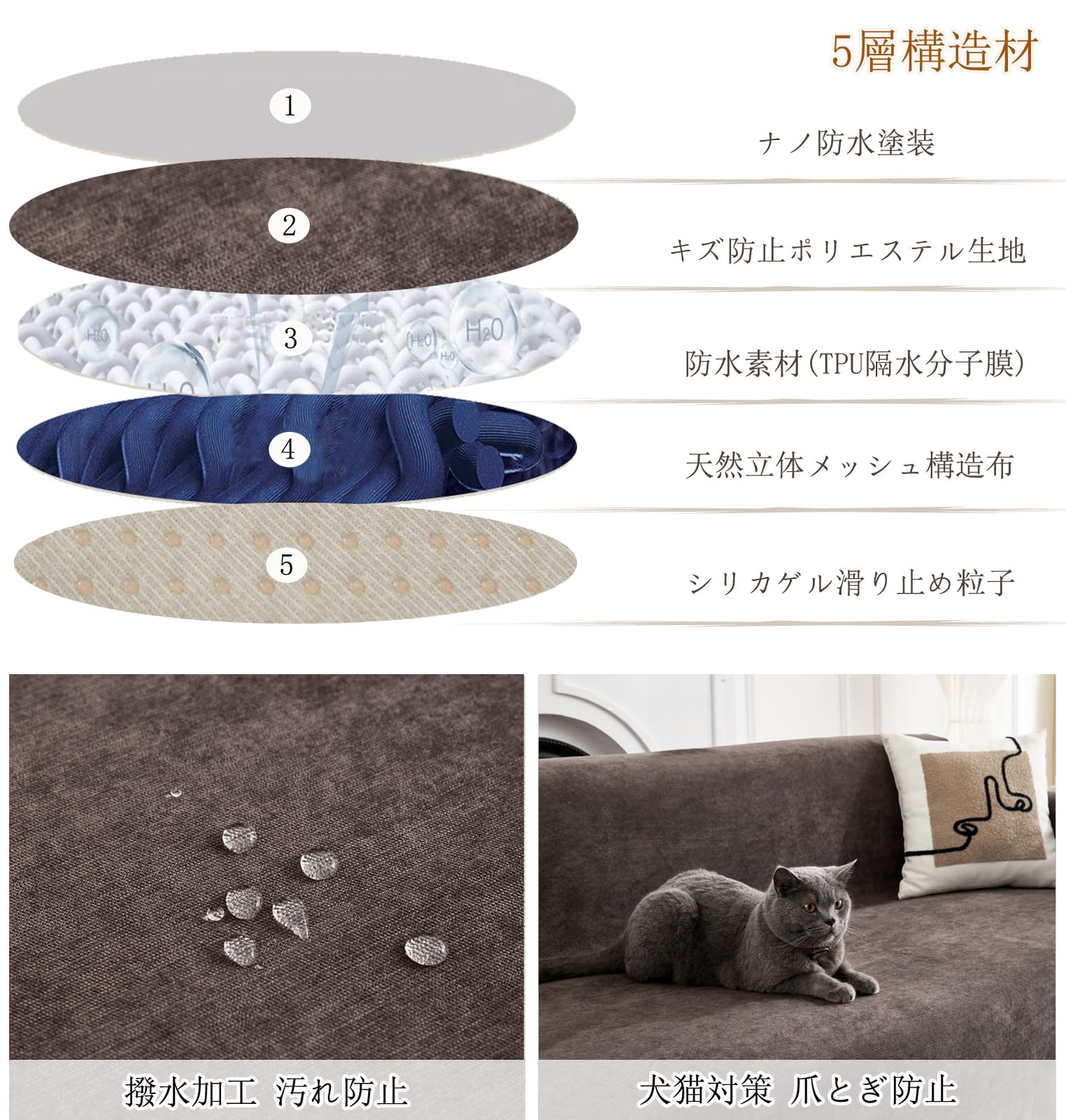 【改良版・防水機能】この5層構造材ソファカバーは表地:ナノ撥水塗装+キズ防止ポリエステル生地 中地:防水素材(TPU隔水分子膜)+天然布 裏地:シリカゲル滑り止め粒子 。普通の単層ソファカバーより防水性、耐久性、耐摩耗性が優れています。