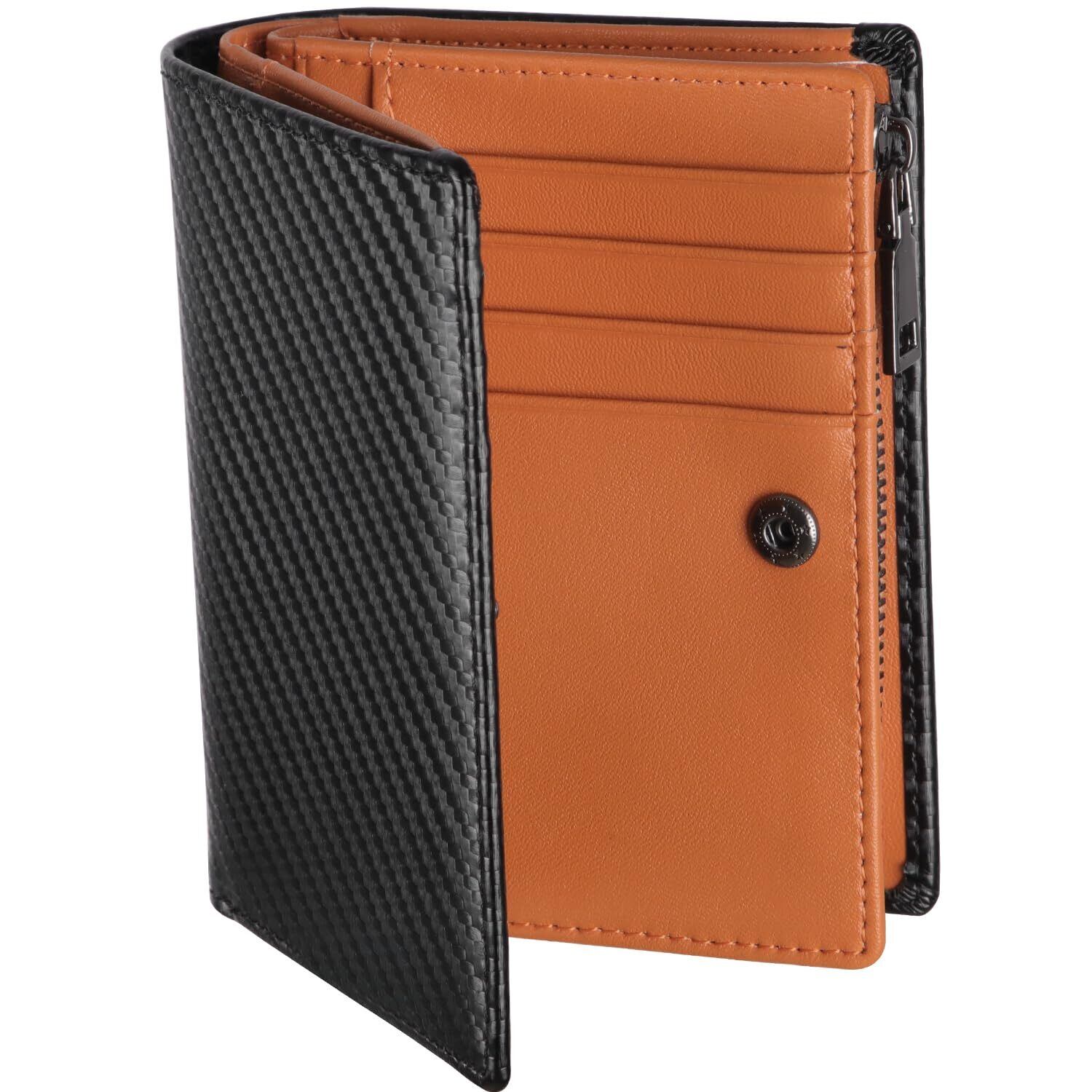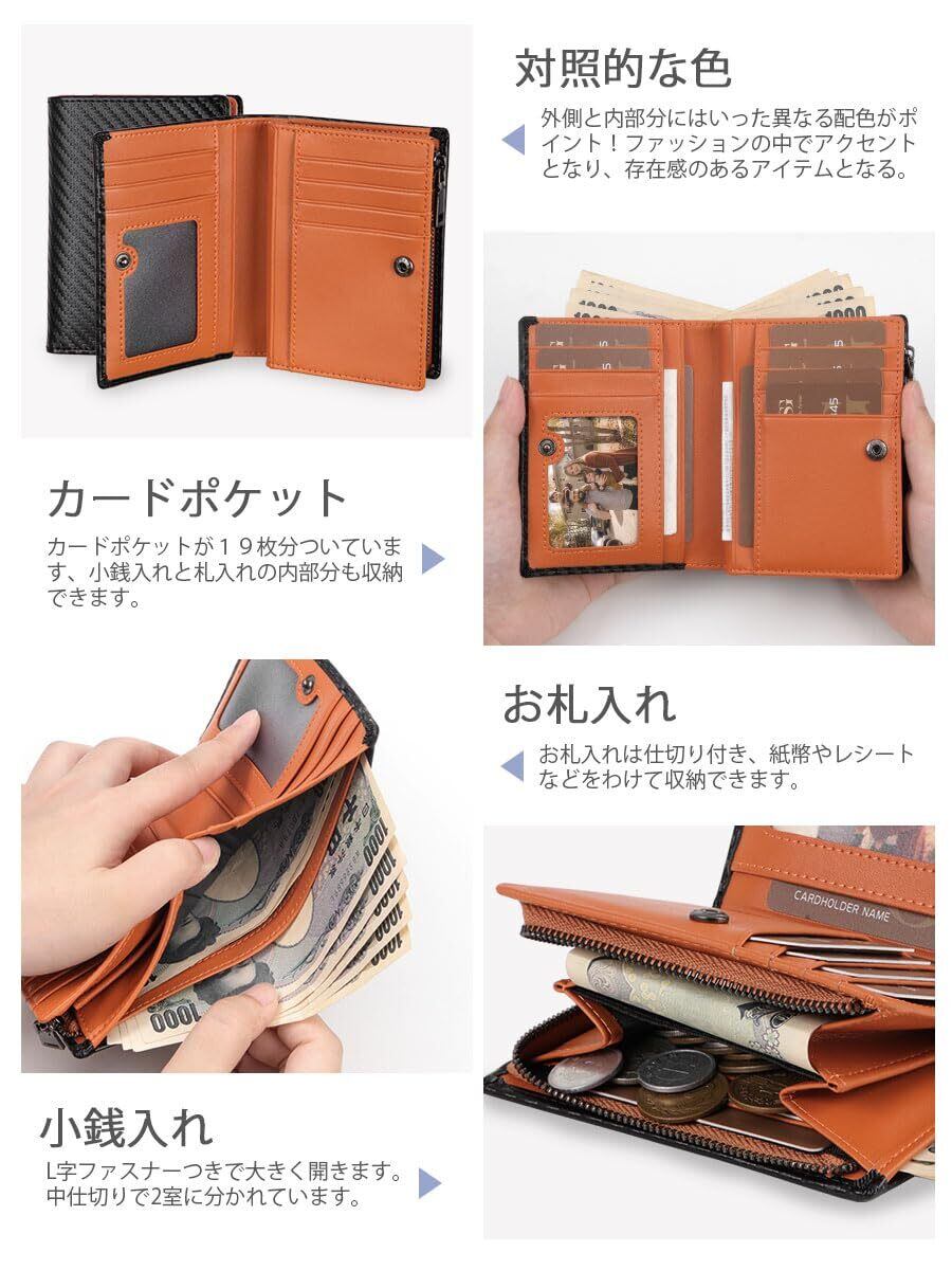 【ポイント1-商品説明】:(カラー4色):ブラック、ブルー、レッド、オレンジ;(サイズ):約12.2*9.7*2.5cm;(仕様):カード入れx19( IDウィンドウ×1)(フリーポケット ×4)、札入れx2、L字型ファスナー小銭入れ× 1;職人がひとつひとつ丁寧に製作いたしまいした二つ折り財布メンズが登場。
