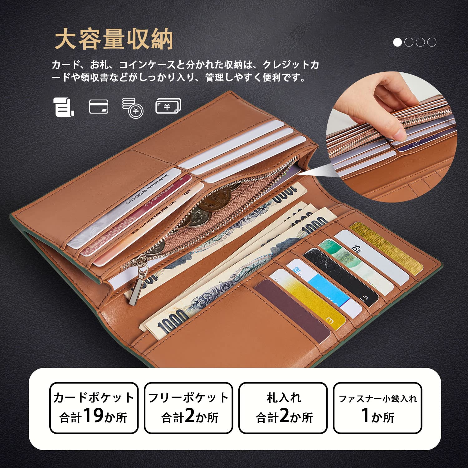 【圧倒的収納力-大容量長財布】(サイズ):約19*9.5*2cm;(カード入れ):最大19枚収納可能です;(フリーポケット):お札、コイン、カードなどを一つに収納できるなので、使いやすさは抜群です;(取り出しやすい小銭入れ):ファスナー式で開閉する小銭入れついてるので、大きく見開き中身が見えやすい!