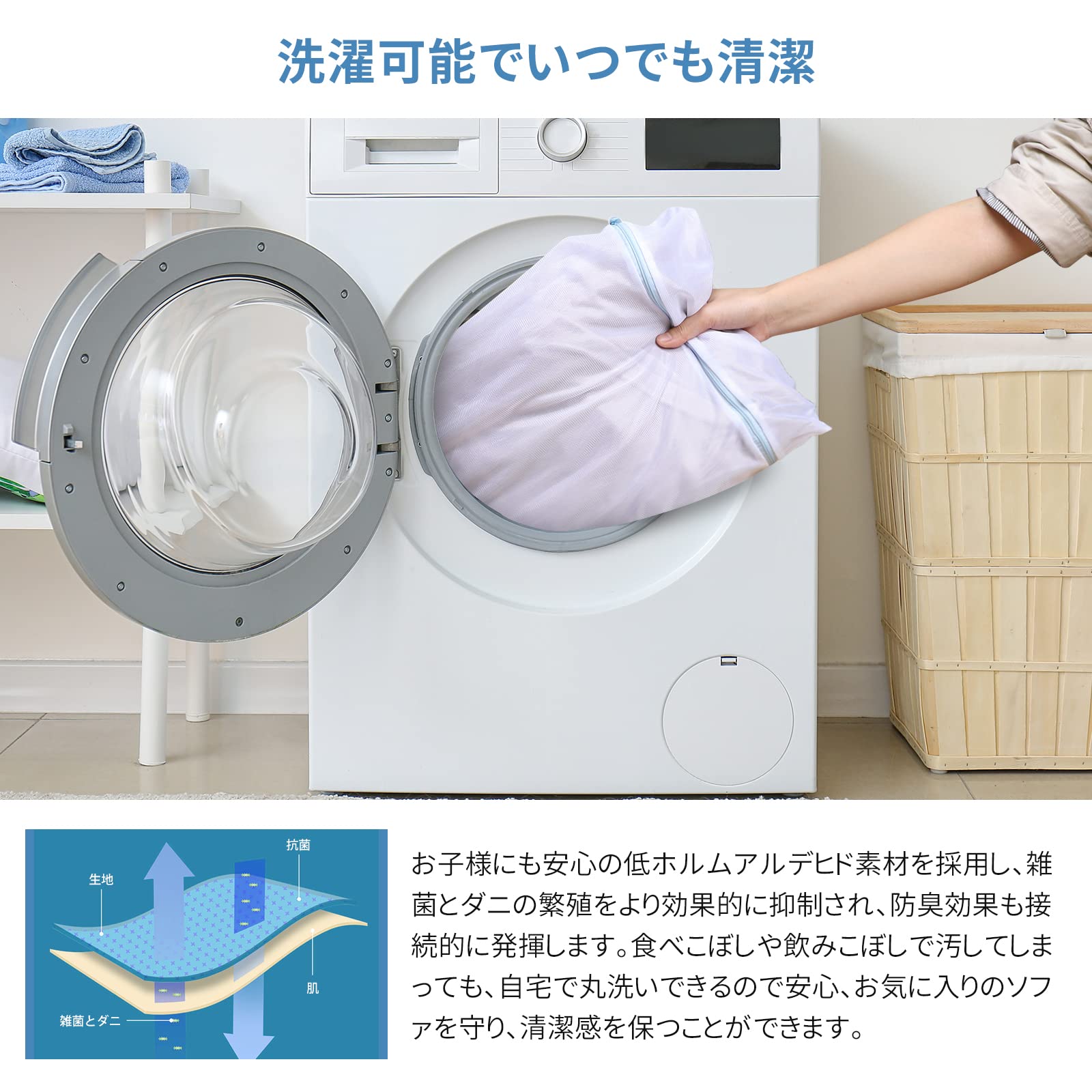 「丸洗いできいつでも清潔」ソファの上でうっかり飲み物や食べ物をこぼして汚してしまっても、カバーを外して自宅で丸洗いできます。洗いやすく乾きやすい素材、付け外しが簡単なので、こまめに洗濯したり天日干ししたりと、衛生的に保つこともできます。子どもやペットのいる家庭などで、食べこぼしや汚れが気になる場合におすすめです。