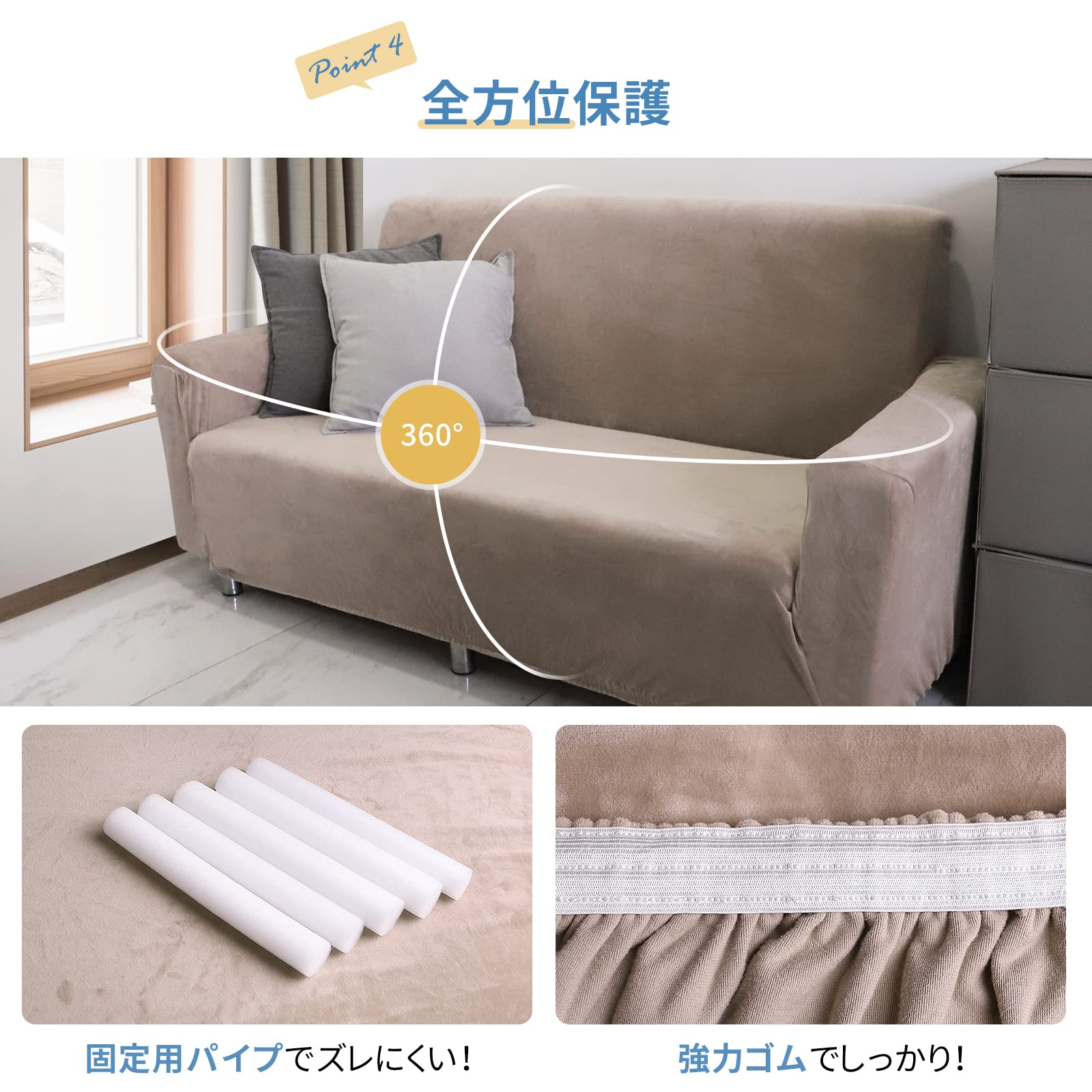 「固定パイプ付きズレ防止」固定用パイプ(2人掛け:固定パイプ4本 3人掛け:固定パイプ5本)が付き、それをソファの座面と背もたれの間の隙間に押し込んで使って、カバーがさらに固定され、形も整ってズレるのを防止します。座ったり立ったりする際のズレや、座り心地を悪くするたゆみなどのストレスを軽減するため、座り心地がよくなります。