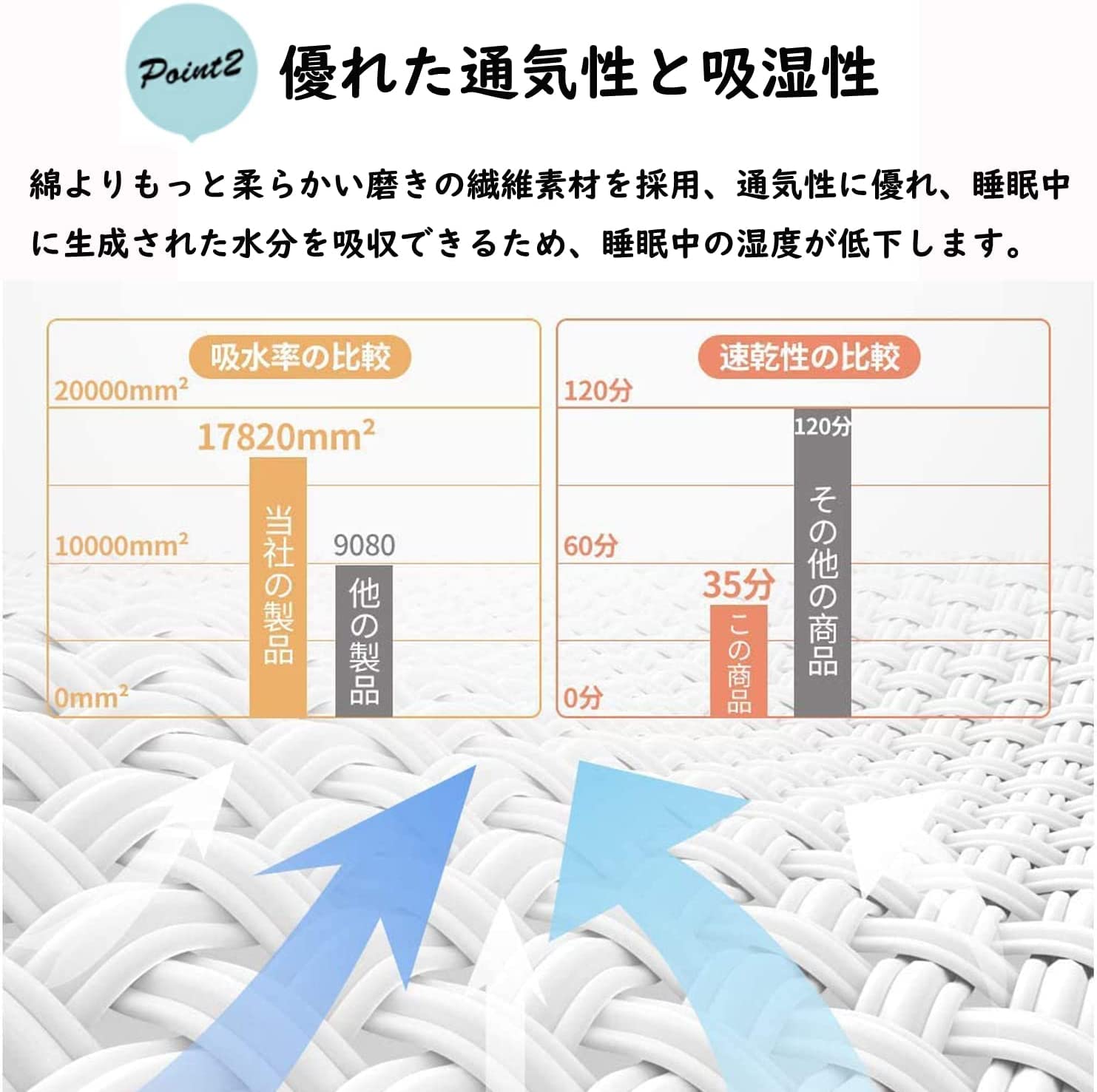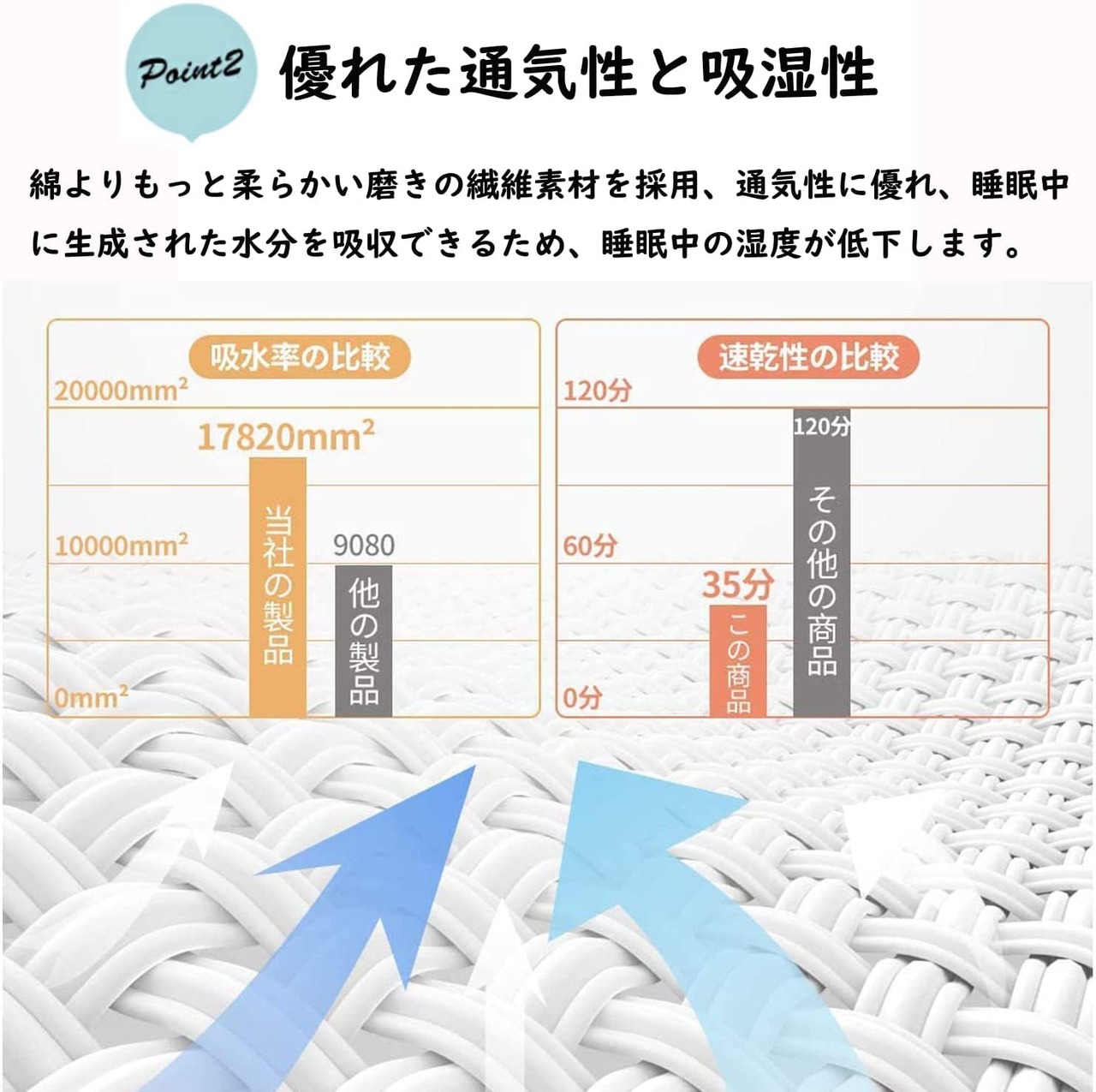 【抜群の速乾性】:速乾性に優れているので、湿気による細菌の増殖を抑えられます。夏は涼しく冬は暖か寝具で、オールシーズンに快眠環境を整えます。さらに速乾性により、梅雨の季節など、洗濯物の乾きにくい時期にも~いつも清潔!
