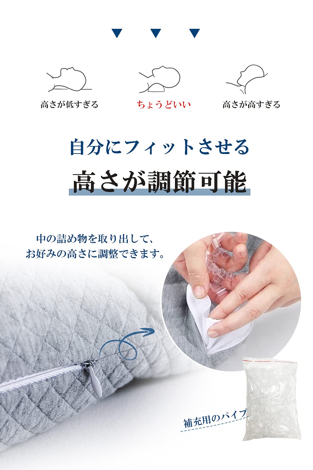 【自由に高さ調節、贅沢睡眠体験】新感覚のパイプ枕が登場します。夏の暑い季節も、冬の寒い季節も、 頭部にはスッキリと涼しく爽やかな寝環境が推奨されています。表面はニット生地で、柔らかくて素肌にやさしいです。サイドのファスナーから補充用のパイプを出し入れできるので、ご自宅でお好みに合った高さに調整することが可能です。