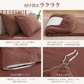 <セット内容&仕様>:「掛け布団カバー(1枚)」:片側に210cm全開ファスナー使用 / 布団留めひも8ヶ所付き ・ 「ボックスシーツ(1枚)」:全周ズレ防止ゴム付き / 通常サイズより大きめなので、高さ3-28cmの敷き布団とマットレスの底まで包む可能 ・ 「枕カバー(2枚)」:封筒型で、出し入れが簡単