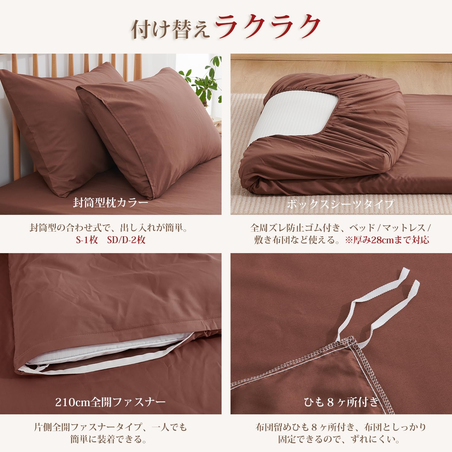 【Amazon.co.jp 限定】クモリ(Kumori) 寝具カバーセット 布団カバーセット 布団カバー シーツ 洋式ベッド・和式布団兼用 掛け布団カバー ボックスシーツ 枕カバー 洗い替え速乾タイプ ピーチスキン加工 セミダブル・4点セット ブラウン