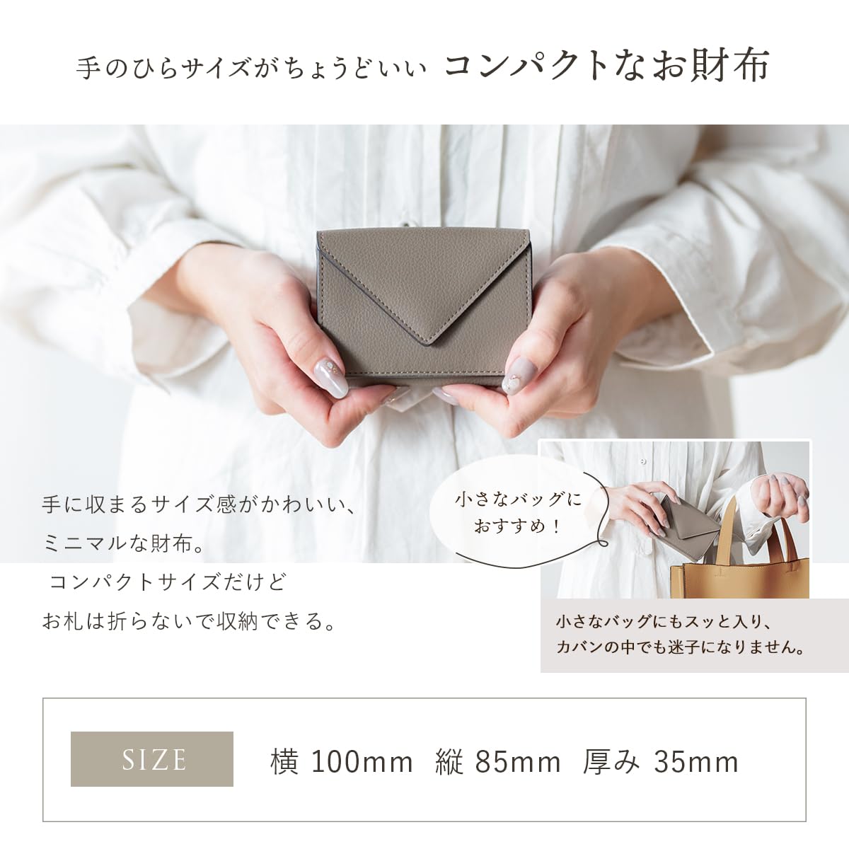 【推奨収納量】・お札 8-12枚・小銭 15-25枚・カード 6枚 【サイズ】・縦 70mm × 横 100mm × 厚み 35mm ・重さ 80g 湿度や個体差により表記の重量・サイズには誤差が出る場合があります。【素材】牛革