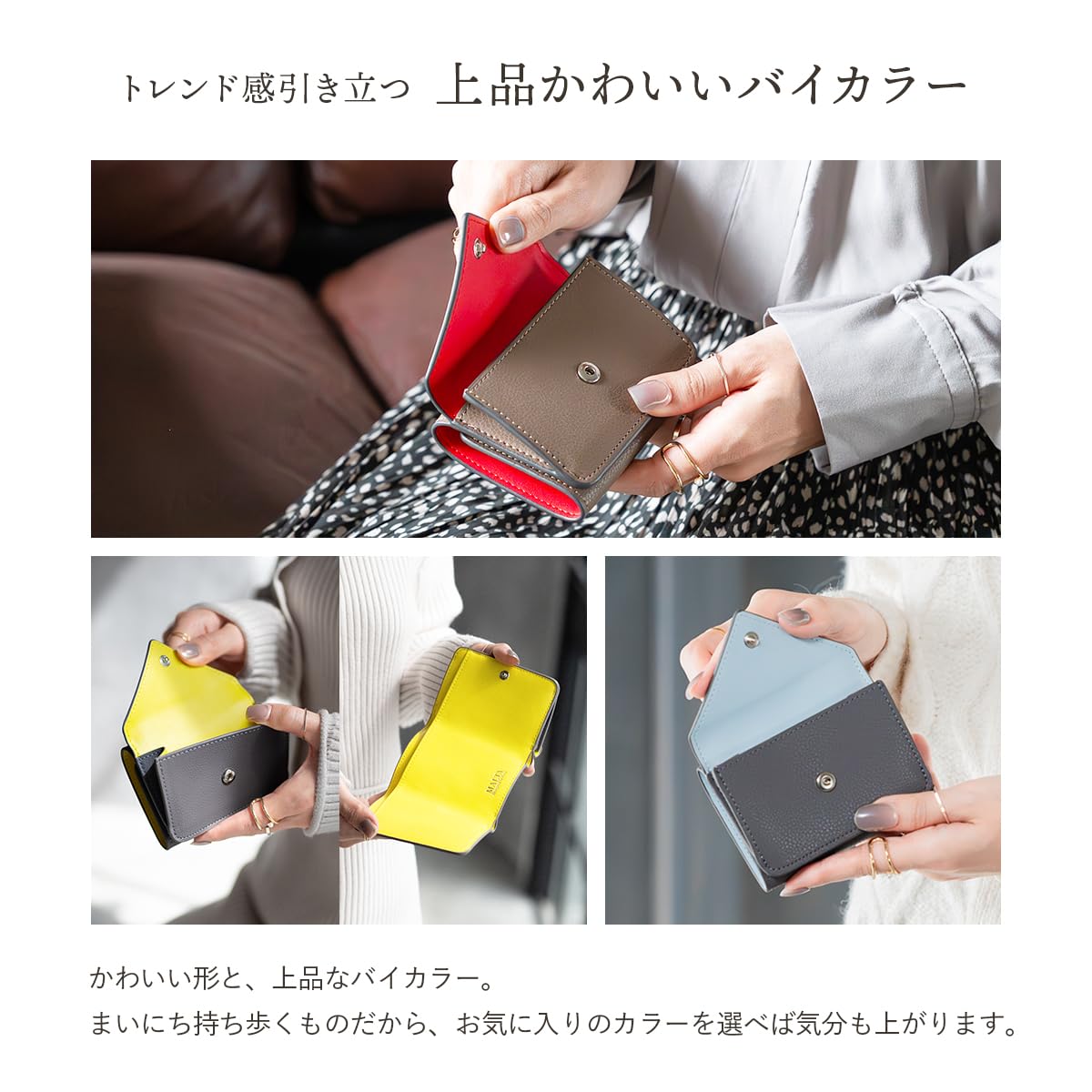 【収納力とコンパクトさを両立】無駄のない三つ折り設計に、ボタン型の小銭入れの組み合わせ。 カードもしっかり6枚収納可能。