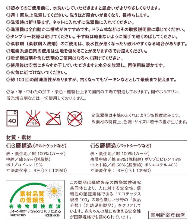 脱脂綿を中芯綿に用い、綿100%のガーゼで両面を保護して丈丈夫なキルティングで仕上げています。
