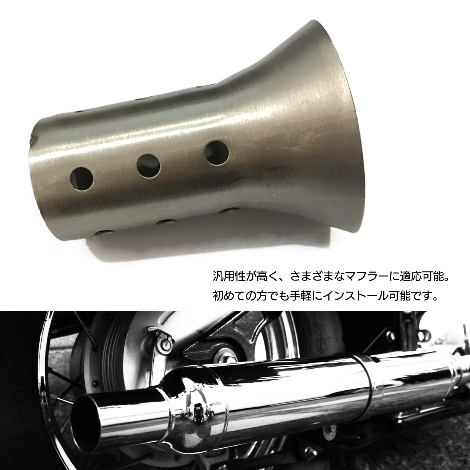 取り付けは工具不要で簡単に行えます。サイレンサーの取り付け部をエキゾーストパイプに挟み込むだけで、しっかりと固定され、手軽に消音対策が可能です。バイクの仕様や排気口のサイズによって適合が異なるため、ご購入前に詳細なサイズを画像にてご確認ください。