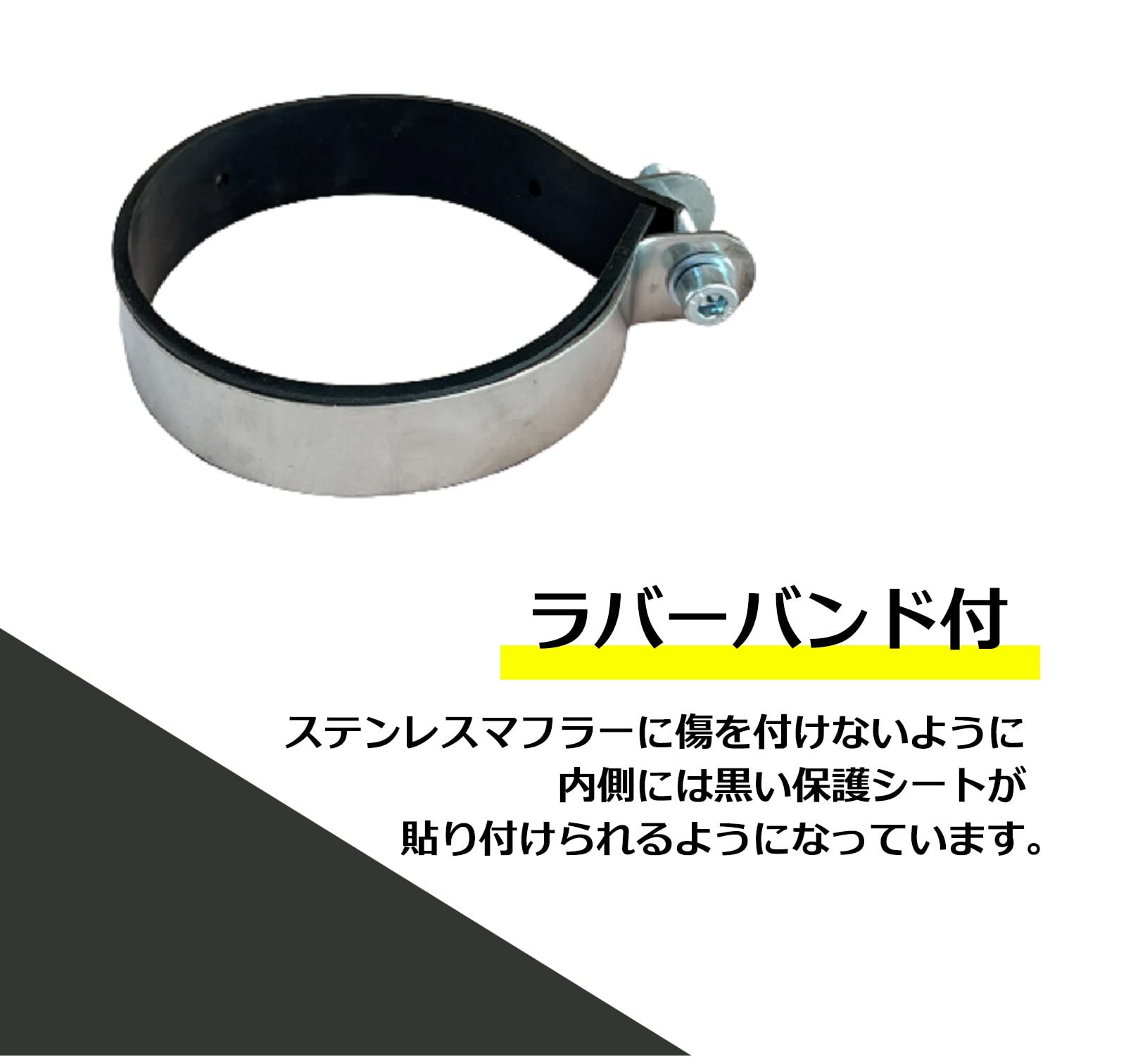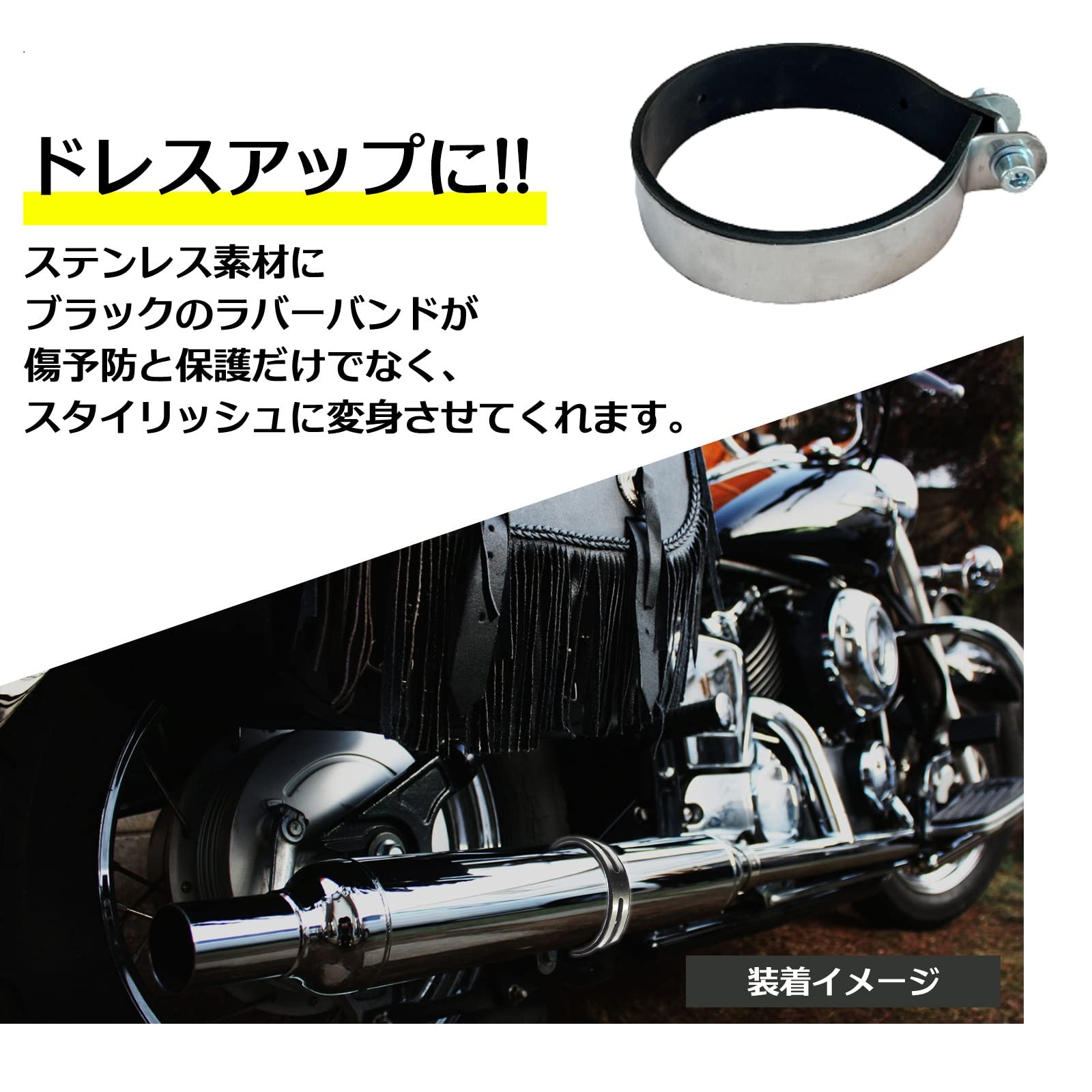 ステンレス製のバンドは耐久性に優れ、長期間の使用が可能です。バンドの内側には黒い保護シートが施されており、マフラーへの傷つきを防ぐ設計となっています。これにより、バイクの外観を損なうことなく、しっかりとマフラーを固定することができます。また、マフラーステーとしても活用でき、バイクのマフラー固定に理想的な選択肢となります。