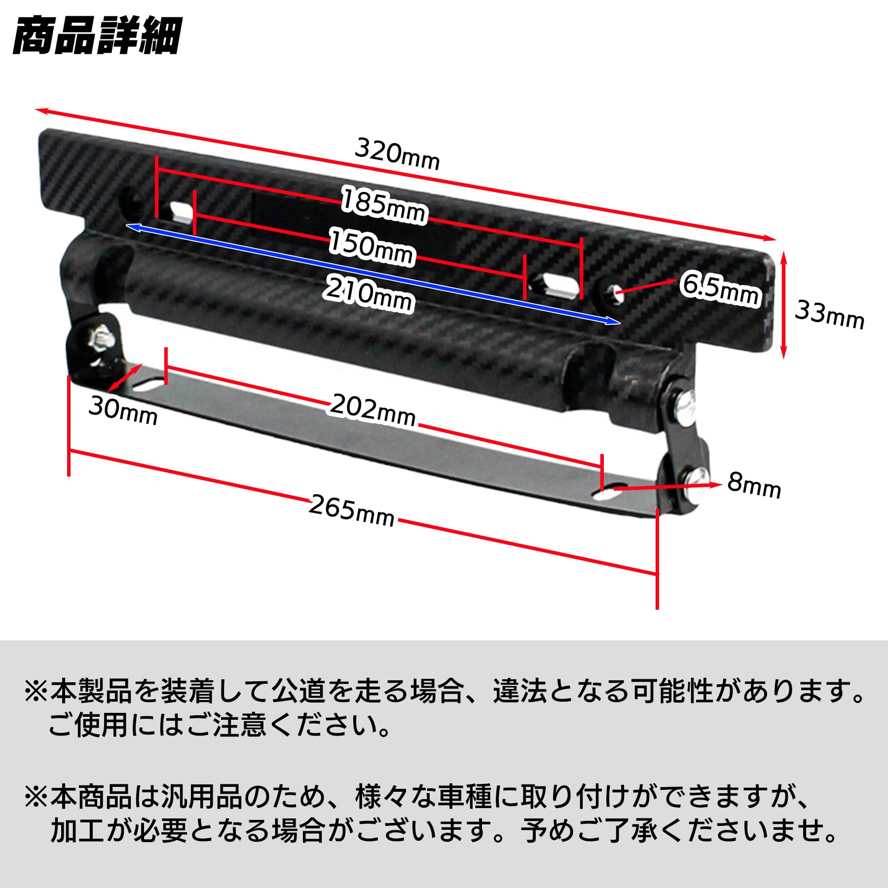 ※本製品を装着して公道を走行する場合、法律違反となる可能性があります。特にナンバープレートの取り付け角度に関する規制がある地域では、事前に関連法規を確認のうえ、ご使用ください。走行会やイベント専用のカスタムパーツとしてご活用いただくことを推奨いたします。