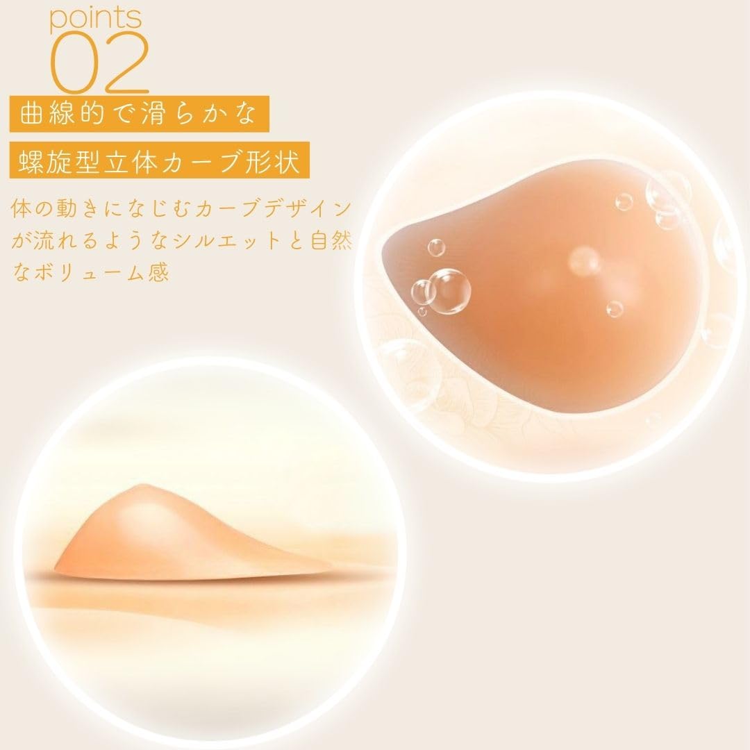 裏面の凹みがご自身のバストにフィットしやすい。裏側粘着、貼付式ですので肌に密着し身体の一部のような一体感を味わえます。