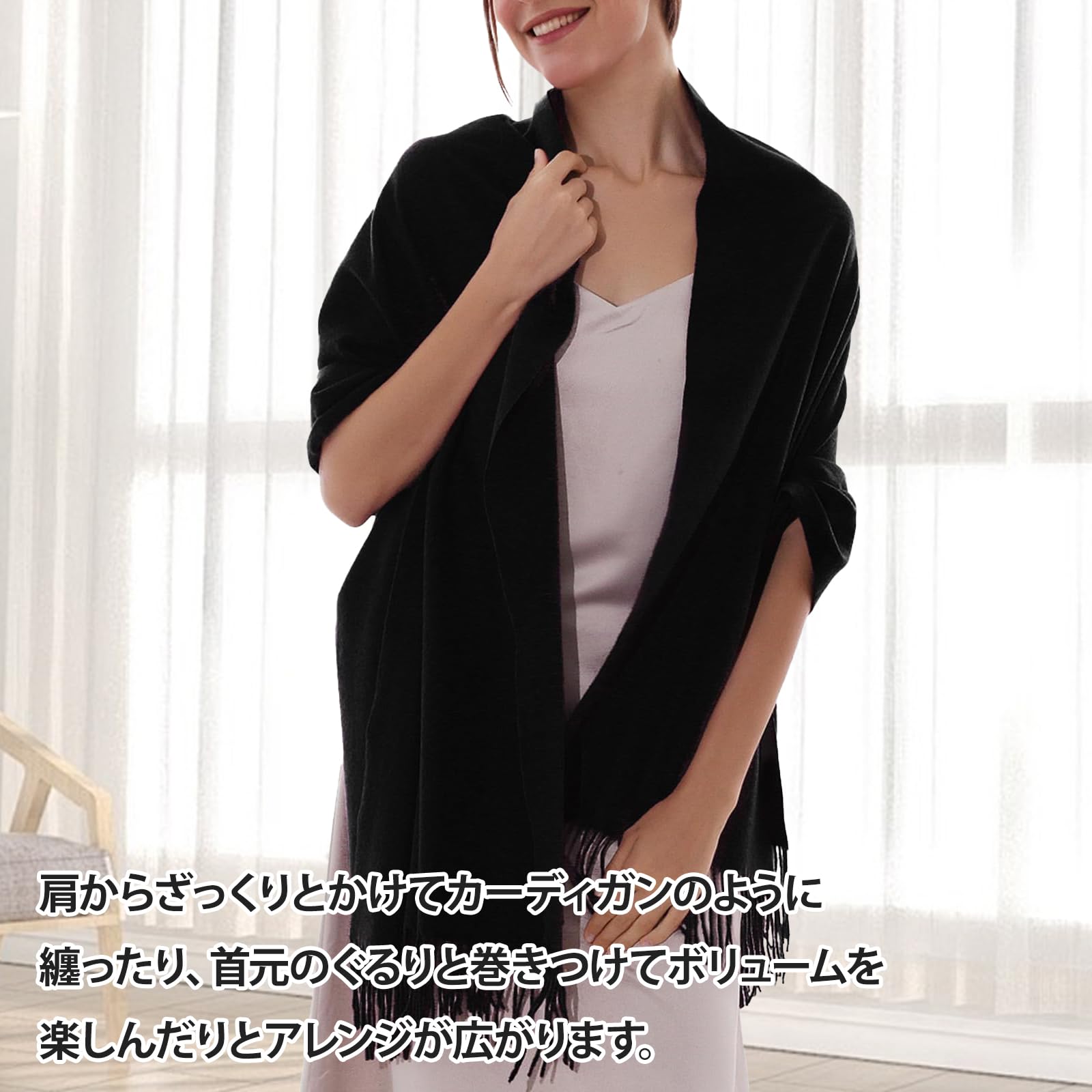 巻アレンジはもちろん、羽織りにも膝掛けにも使える。カシミヤタッチなので、ウールが苦手な方にもオスス