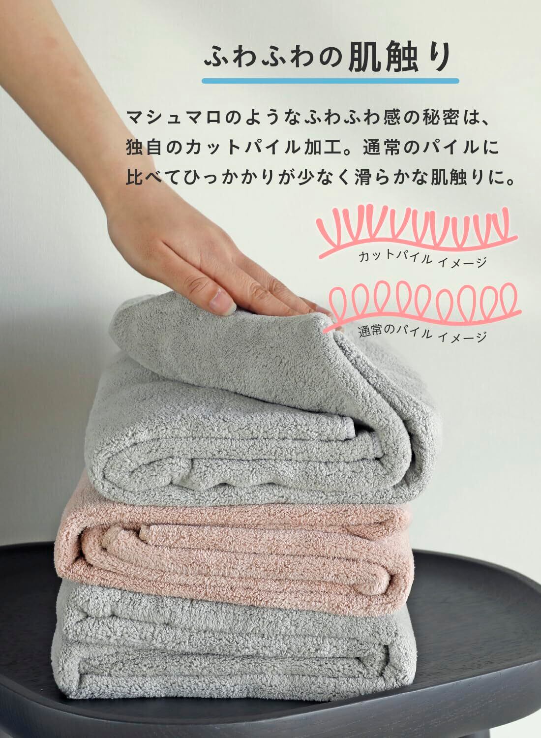 【マシュマロのような肌触り】通常織りあがったタオルは両面ともパイル状になっているため、引っかかりやすい。表面を刈り取っているため引っかかりにくく、上質で滑らかな肌触りに。