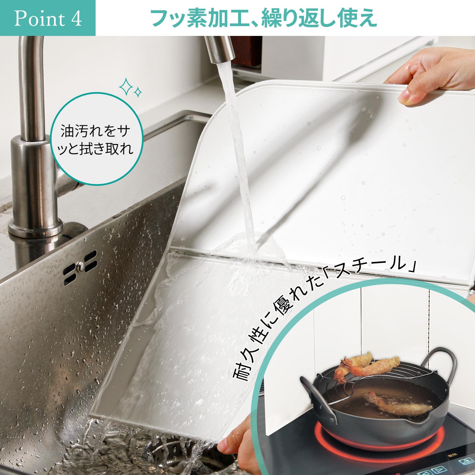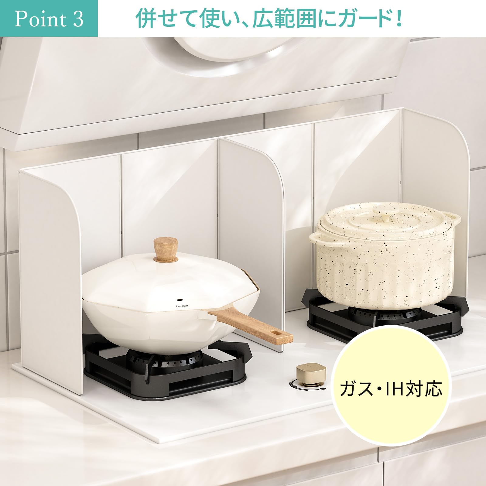 「油はね・飛び散りをしっかりガード」ジャバラに折れる4面式は、調理スペースに合わせて囲み方を自由に変えられる!揚げ物や炒め物などの調理中に、コンロ周りや鍋、フライパン周りに立て、それ以上油が飛び散らないようにしてくれます。キッチンの壁やコンロ周りの油汚れを手軽に予防することもできます。