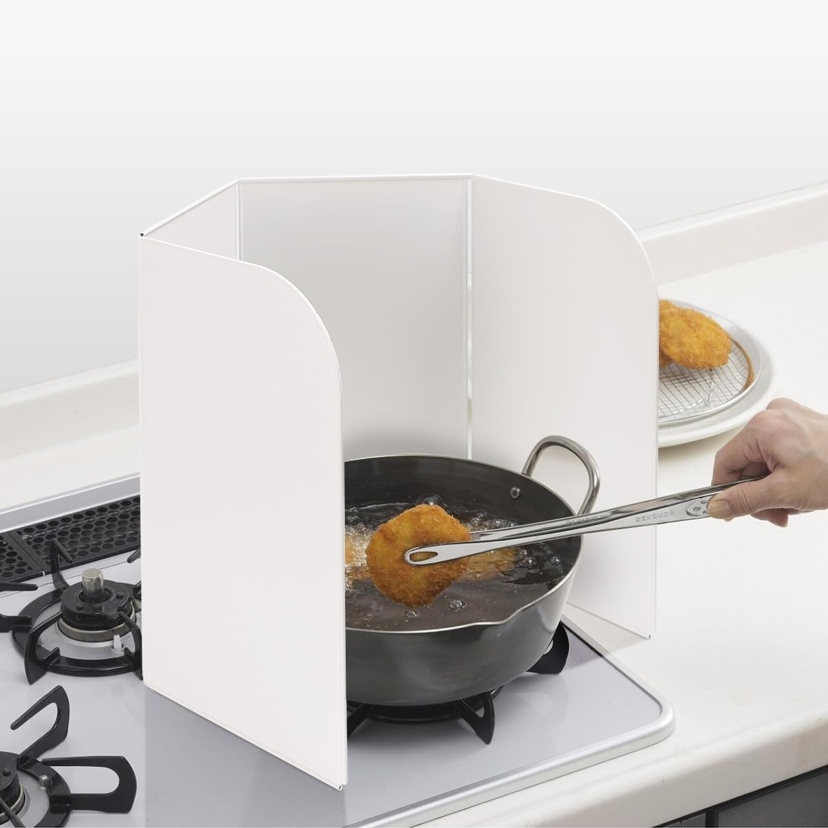 「油ハネを防ぐ4面式」■サイズ /真っ直ぐ広げた時:(約)幅73×奥行0.3×高さ32cm 折りたたんだ時:(約)幅18×奥行1.1×32cm ■材質 /本体:スチール・(表面フッ素樹脂加工) ※商品改良のため、仕様・デザインなどは予告なく変更する場合があります。予めご了承いただきますようお願い申し上げます。